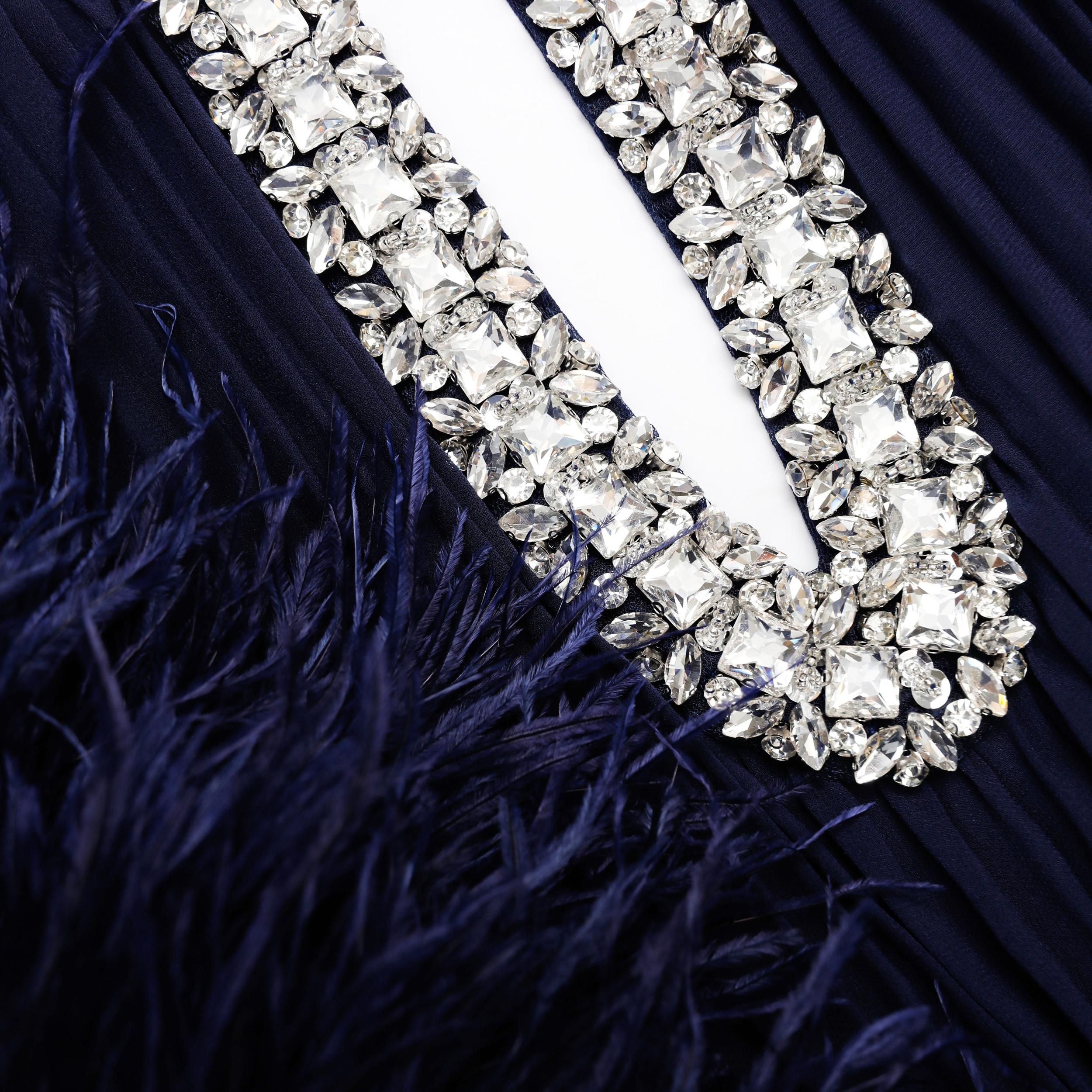 Signal dark romance in this pleated chiffon midi dress which boasts sparkling diamanté trims around the neckline and dramatic feather cuffs. Pair with our statement earrings for extra style points.True to sizeRelaxed fitConcealed zip closure at backKeyhole detail at frontOmbré feather cuffsModel is 5ft10/178cm and wears a size UK 6