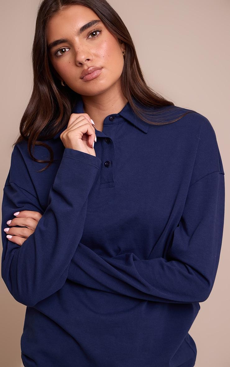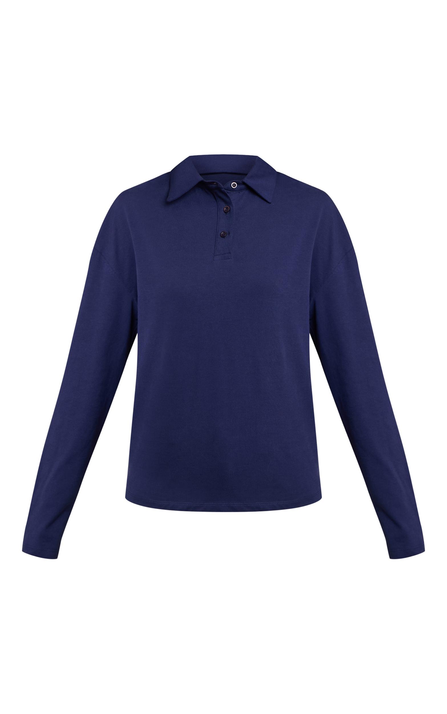 A discerning approach to daywear begins with versatile foundations. The navy cotton polo collar long sleeve top champions a streamlined silhouette, featuring a crisp polo neckline and a neat two-button placket that lends a refined edge. Its generous long sleeves and relaxed cut cultivate an understated confidence, making it an essential piece for your curated rotation. Integrate this versatile top with sharp wide-leg pants for a balanced profile, then complete your daytime ensemble with sleek ankle boots and a subtle stack of silver jewelry, affirming an effortless command of contemporary style.Length approx 48.5cm/19inch (Based on sample size US 4)Model wears size UK 8/ EU 36/ AUS 8/ US 4Model Height - 5ft 7inchp]:!mb-4inch>Brand: PrettyLittleThingCategory: TopsProduct type: Oversized T-ShirtColor: NavyMaterial: Cotton JerseyOccasion: Day