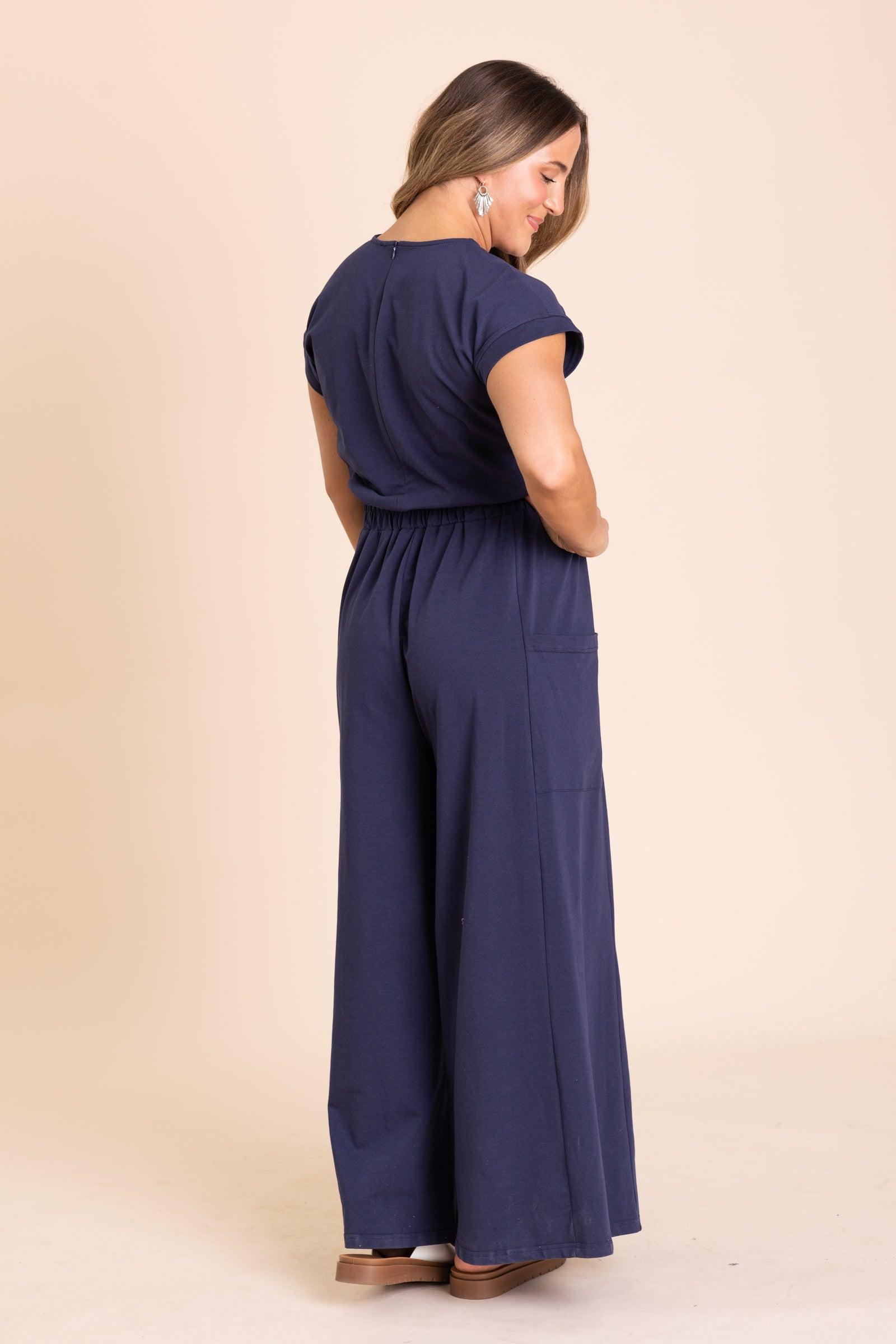 Product Details Colors: Navy Print: Solid Neckline: Round Sleeves: Short Sleeves Hemline: Straight Brand: Jodifl Material and Care 80% Cotton 20% Polyester Hand Wash Cold Line Dry Size and Fit Small: Bust 38" Waist 28" Rise 16" Inseam 27" Length 58" Medium: Bust 40" Waist 30" Rise 15.5" Inseam 26" Length 58.5" Large: Bust 42" Waist 32" Rise 16" Inseam 26" Length 59" Model is 5'7 and is wearing a size small