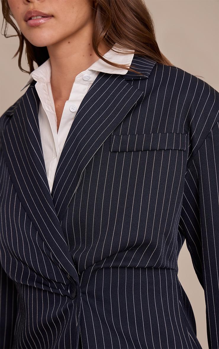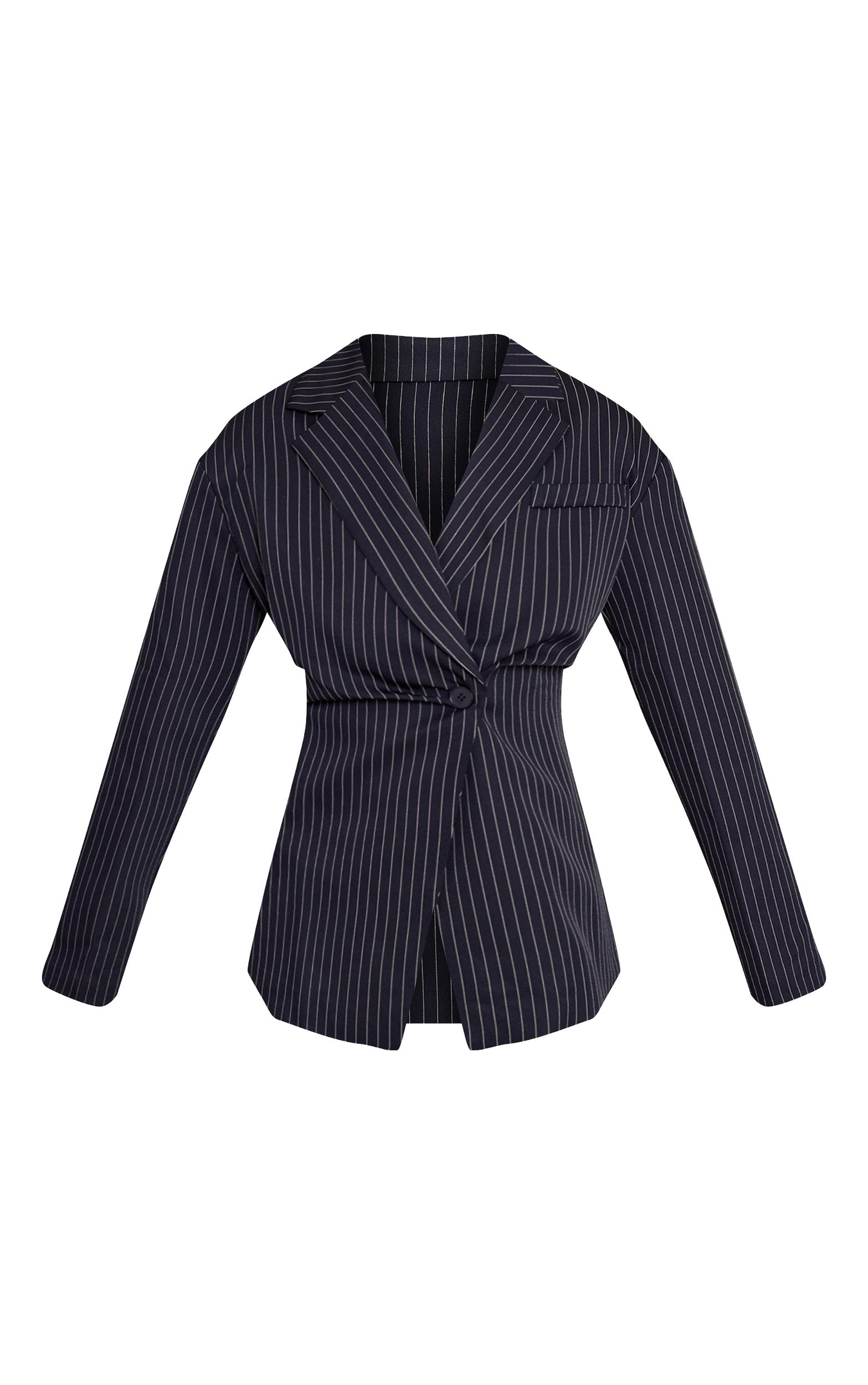 Make a statement in the navy pinstripe gathered cinched waist blazer. Constructed in navy pinstripe woven fabric, this blazer is defined by a cinched waist and sharp tailored fit. Team with wide leg pants and loafers for a power-dressing edit.Length approx 48.5cm/19inch (Based on sample size US 4)Model wears size UK 8/ EU 36/ AUS 8/ US 4Model Height - 5ft 9inchp]:!mb-4inch>Brand: PrettyLittleThingCategory: OuterwearProduct type: Fitted BlazerColor: NavyMaterial: Tailored WovenOccasion: Day