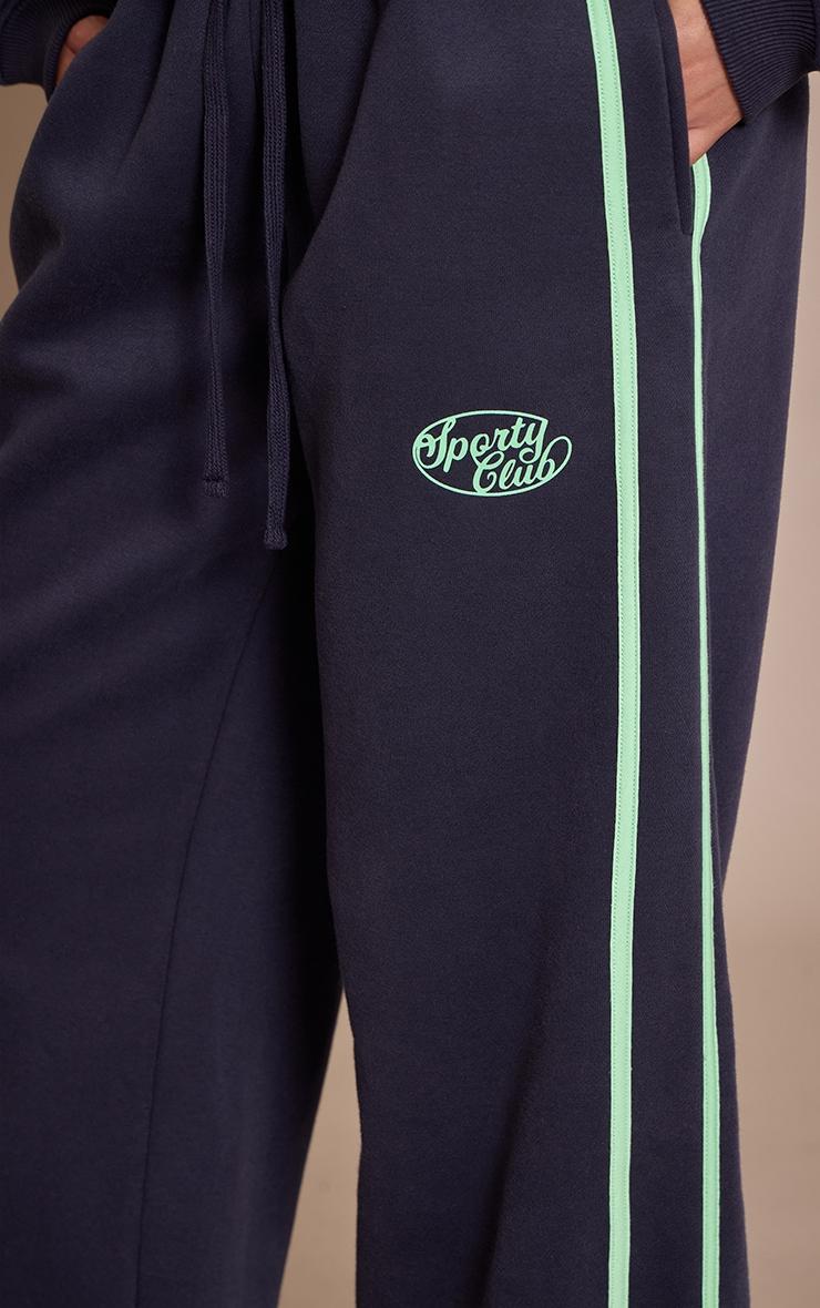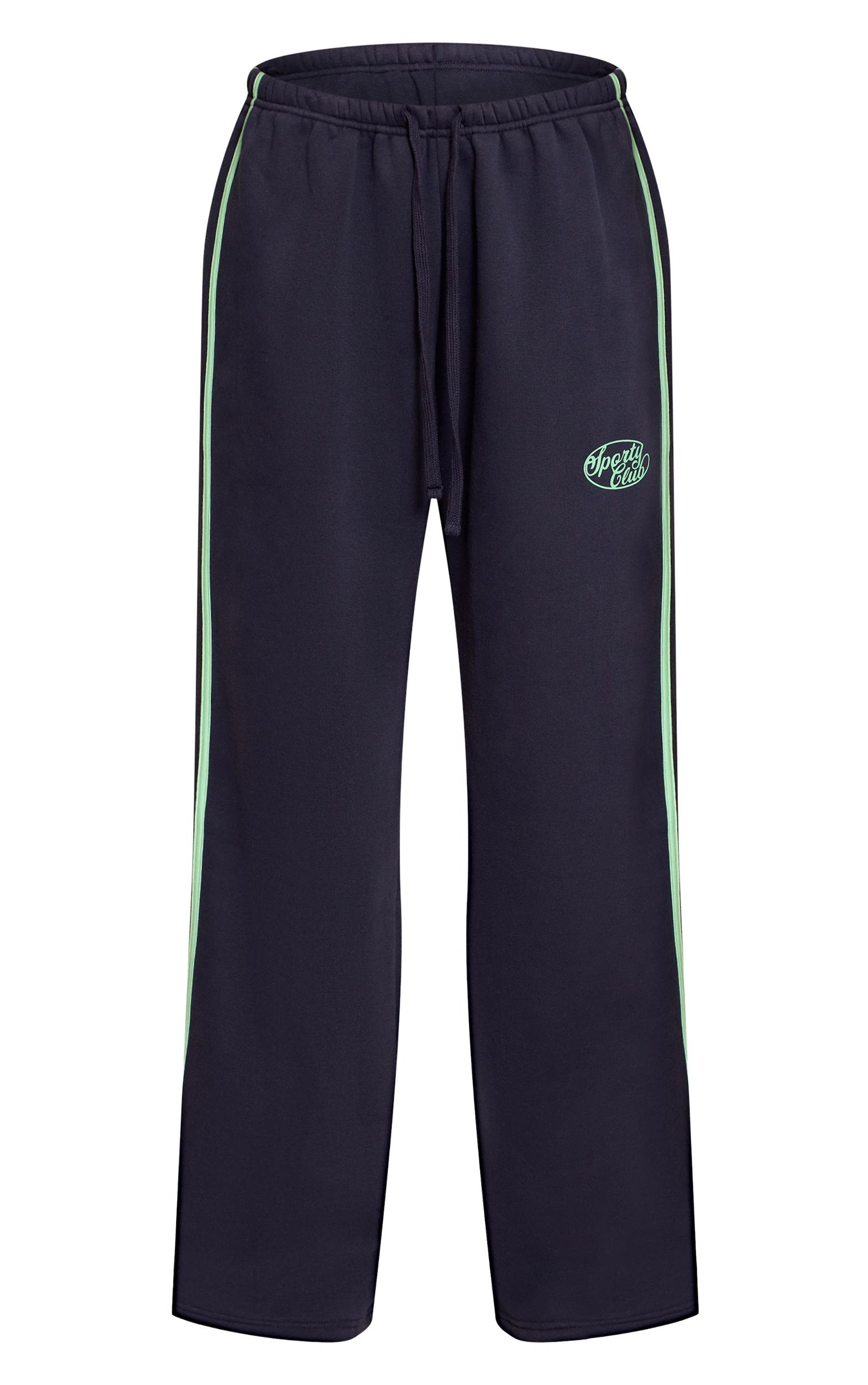 Effortless style meets dynamic design in these navy sports club print wide leg sweatpants. Crafted in a deep navy, they boast a relaxed wide-leg silhouette, bold lime green side stripes, and a signature 'Sports Club' print. These sweatpants are your go-to for making an assured statement, whether running errands or owning your weekend. Pair with the matching zip-through hoodie, sneakers, and a minimal gold ring for an assured, fashion-forward ensemble.Length approx 76cm/30inch (Based on sample size S)Model wears size SModel Height - 5ft 10inchp]:!mb-4inch>Brand: PrettyLittleThingCategory: AthleisureProduct type: Straight Leg JoggersColor: NavyMaterial: Fleeceback SweatDesign: PlainOccasion: Day