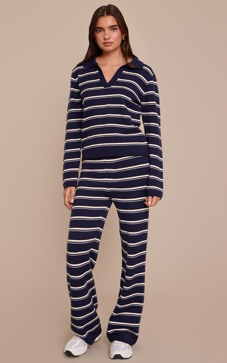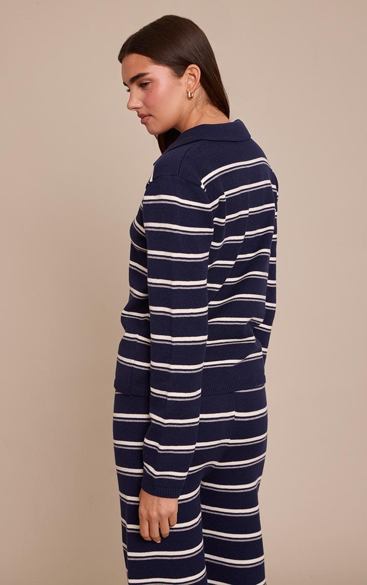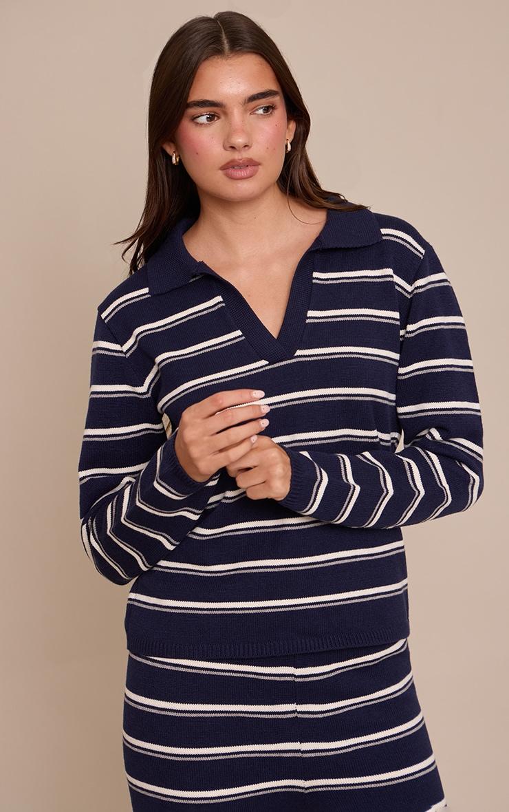Master laid-back cool in the navy striped rugby knitted top. This knit showcases a classic polo collar, bold navy and white stripes, and long sleeves for an easy fit. It's ideal for effortless coffee runs or relaxed weekend meet-ups. Pair with the matching knitted bottoms, sleek boots, and delicate pearl earrings for an understated look.Length approx 48.5cm/19inch (Based on sample size S)Model wears size SModel Height - 5ft 7inchp]:!mb-4inch>Brand: PrettyLittleThingCategory: KnitwearProduct type: TopColor: NavyMaterial: Rib KnitOccasion: Day