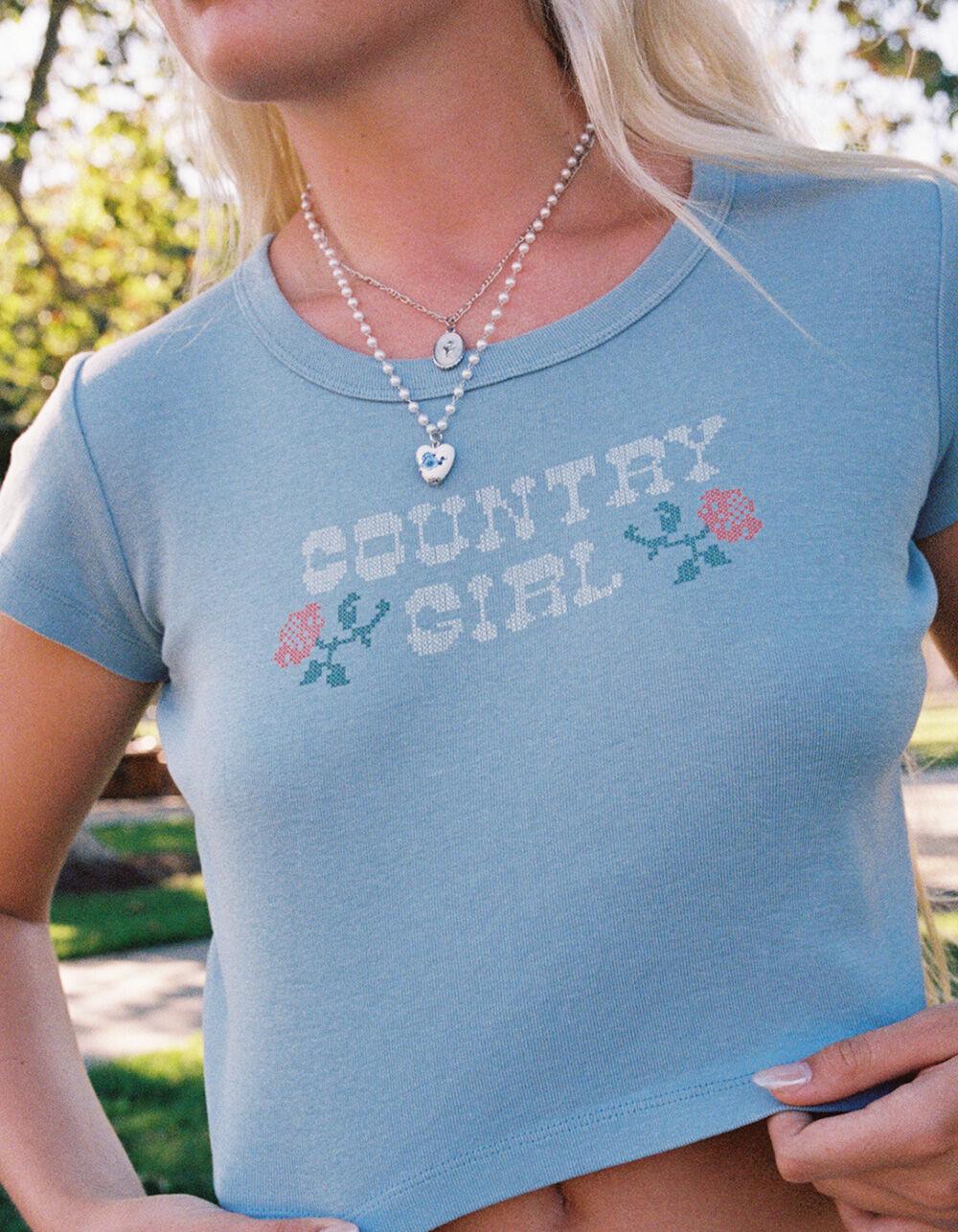 BLUE. Nectar Clothing Country Girl Baby Tee. Country Girl graphic on front. Baby tee silhouette. Crew neck. Short sleeve. 100% Cotton. Machine wash. Imported.