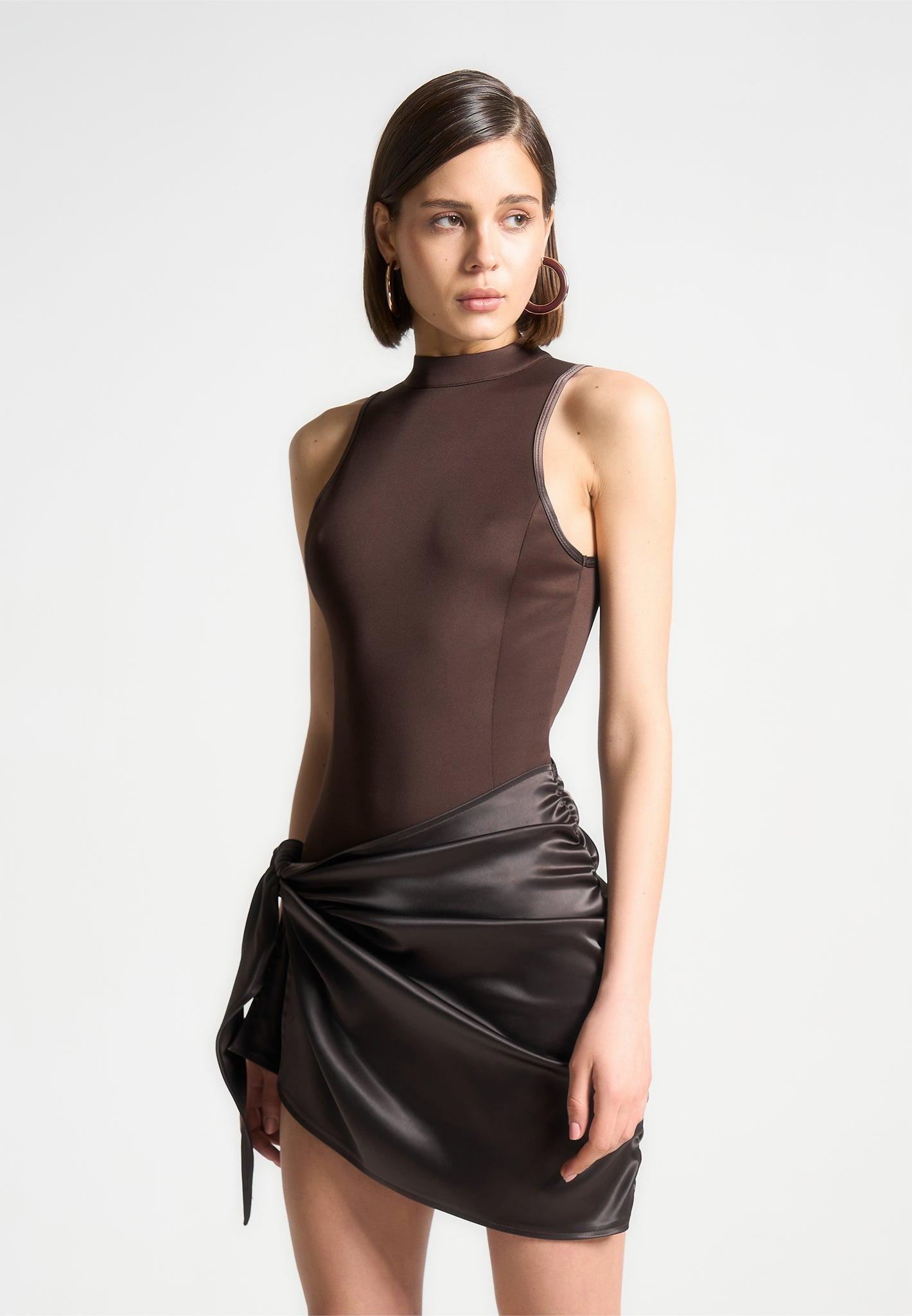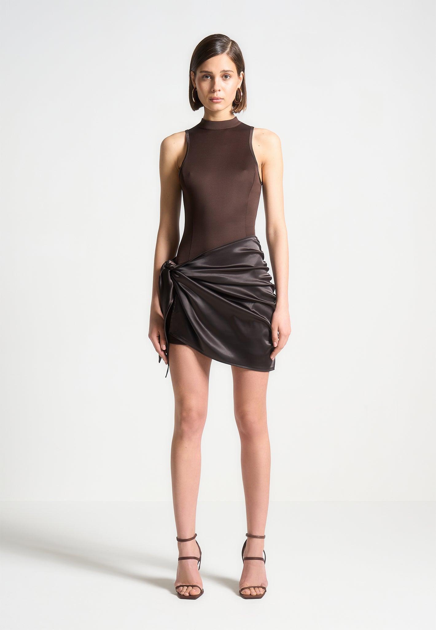 Brown Neoprene & Satin Wrap Bodycon Dress A sexy addition to our dress collection, this bodycon dress perfectly contrasts in fabric to make this an eye catching piece. The satin wrap adds body to the silhouette and provides a contouring illusion from the slim fit waist. We recommend sizing up if you are in between sizes. Bodycon Dress Silhouette Neoprene Base Fabric Double Backed Satin Wrap Silver Manière De Voir Plaque Fabric: 98% Polyester, 2% Elastane / 87% Polyester, 13% Elastane Always check the care label for wash instructions. Model is 5'8", 32.5" Bust, 24" Waist, 32" High Hip, 37.5" Low Hip and Wears UK Size 6 Based on UK Size 6 - Front Length 78.5cm/30.9in, Chest 92cm/36.2in WMN2269-11