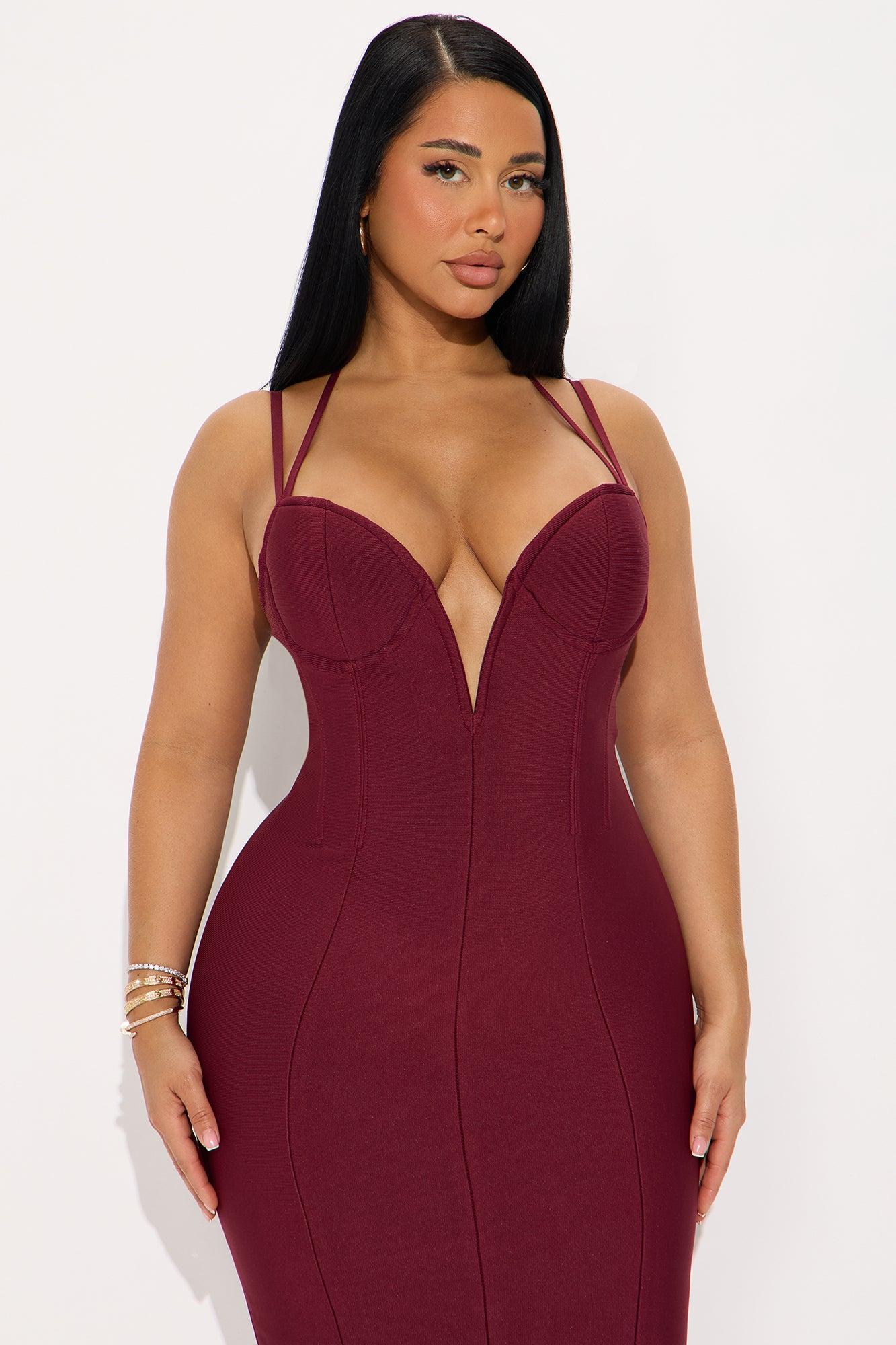 Available In Black And Wine. Bandage Midi Dress Adjustable Spaghetti Straps Tie Halter Detail Deep V-Neckline/V-Wire Padded Bra Cups Underwire Corset Waist Back Slit Zipper Stretch Length Measured Flat = 43" Shell : 95% Polyester 5% Spandex Lining : 100% Polyester