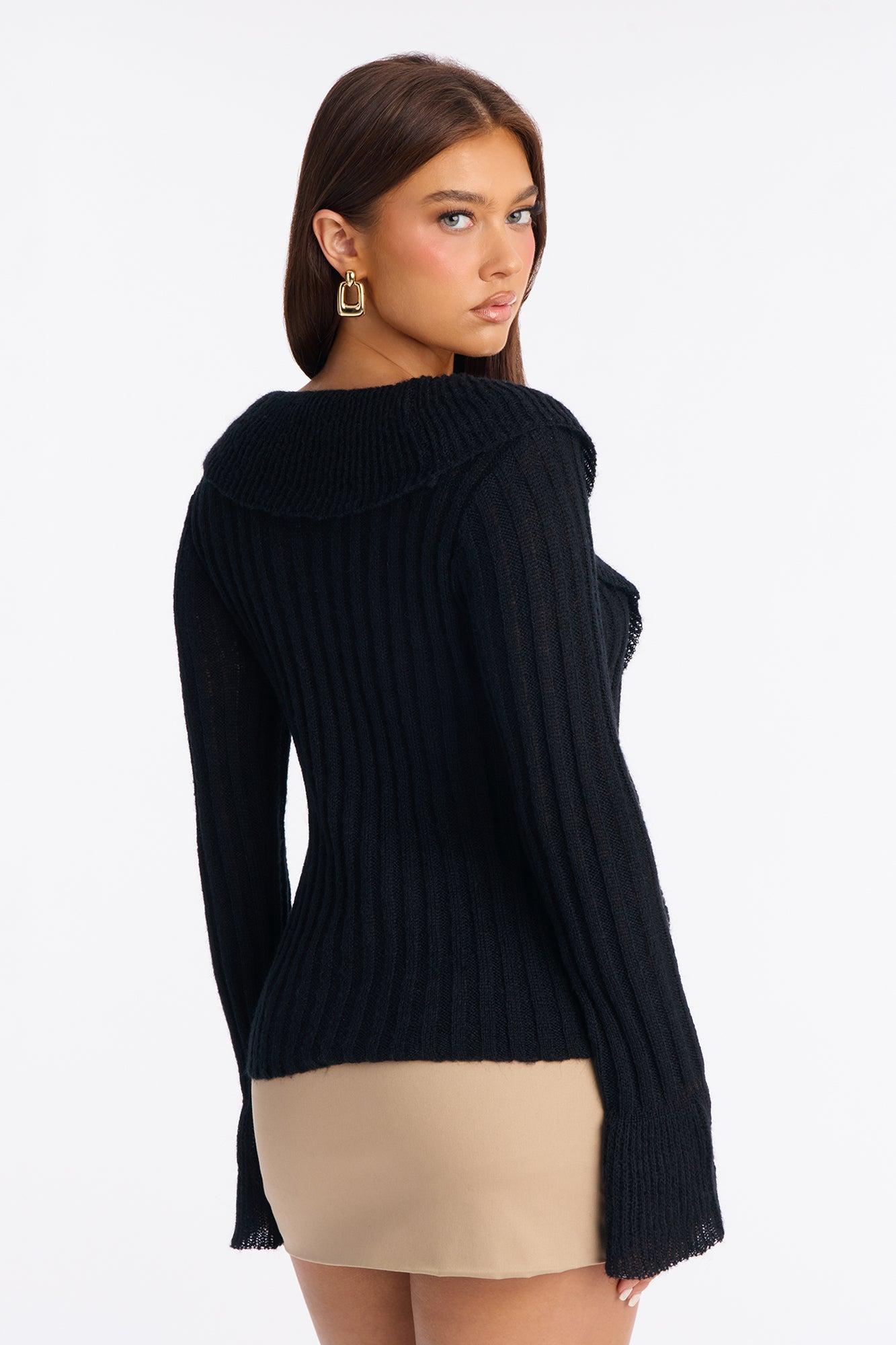 TieRed ruffle sleeve black sweater