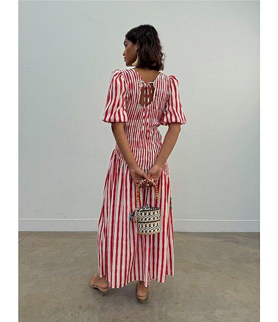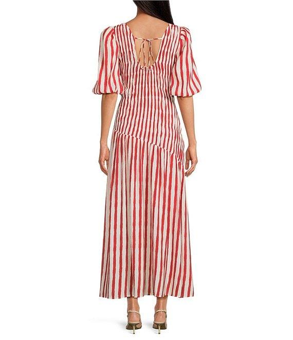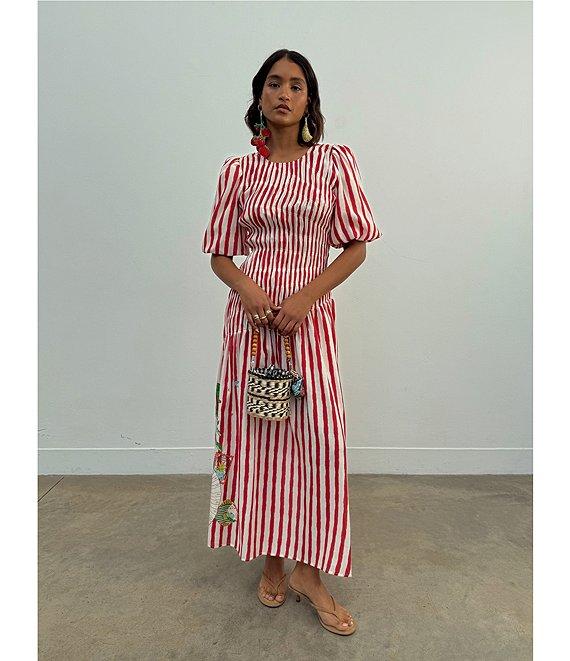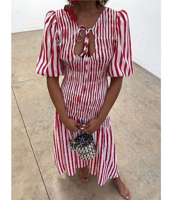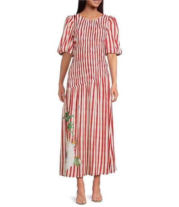 From Never Fully Dressed, this dress features:Stripe print Graphic print detail Crew neckline Short puff sleeves with elastic cuffPull-on constructionElastic asymmetric shirring bodice Front keyhole tie Unlined Approx. 54" lengthViscose/polyester Machine washImported.*Can be worn both ways*