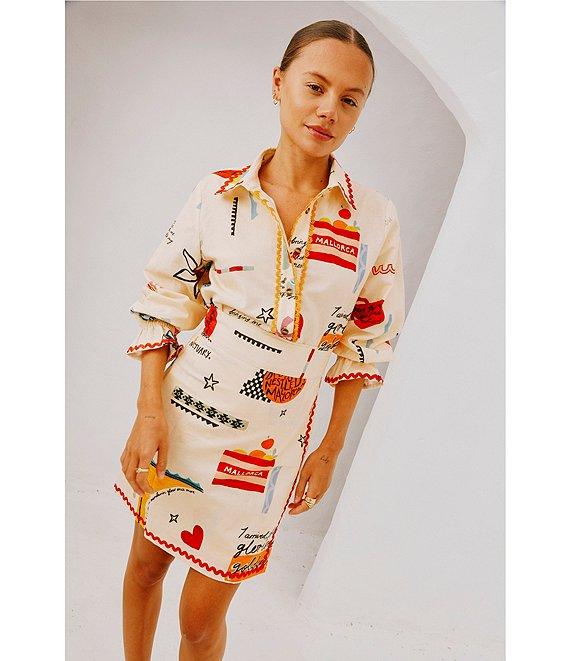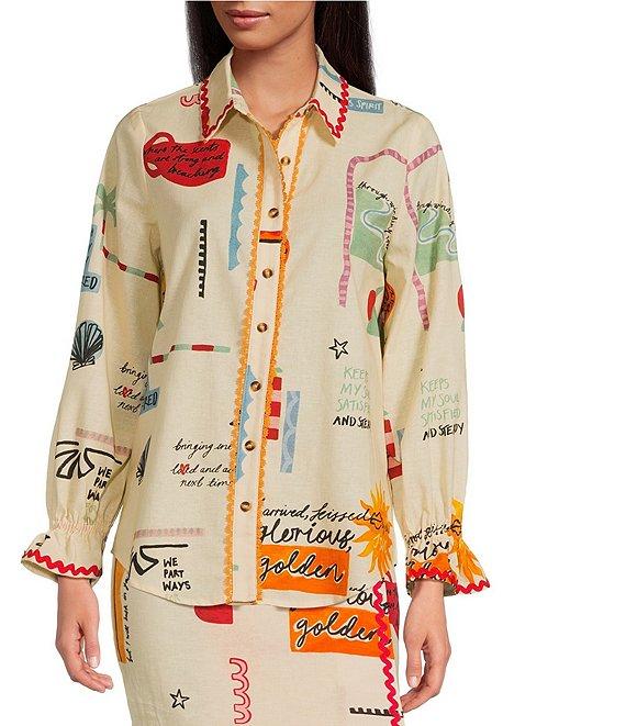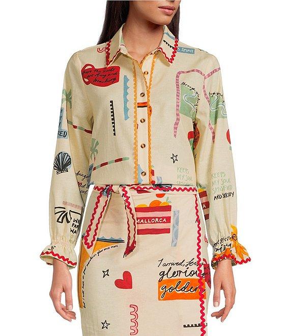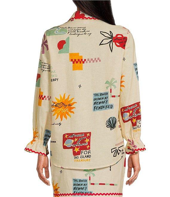 From Never Fully Dressed, this shirt features: Linen fabrication Novelty print Point collar Button down closure 3/4 sleeve Elasticated cuff detail Ric-rac trim Approx. 27.16 Cotton/Linen Machine washable Imported