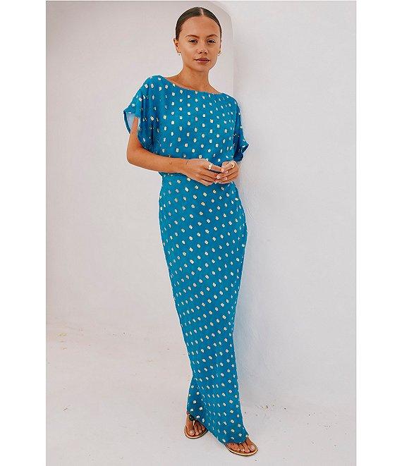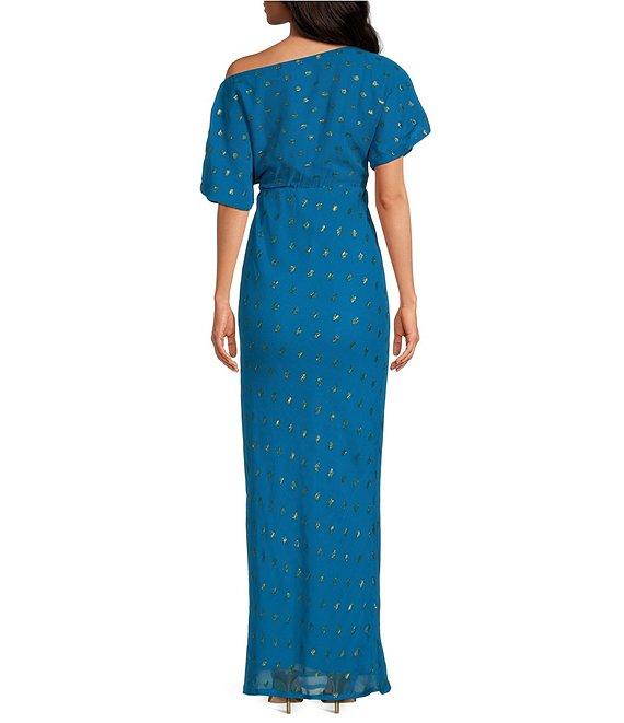 Never Fully Dressed Tilly Plisse Gold Foil Fleck Print One Shoulder Neck Short Sleeve Maxi Dress