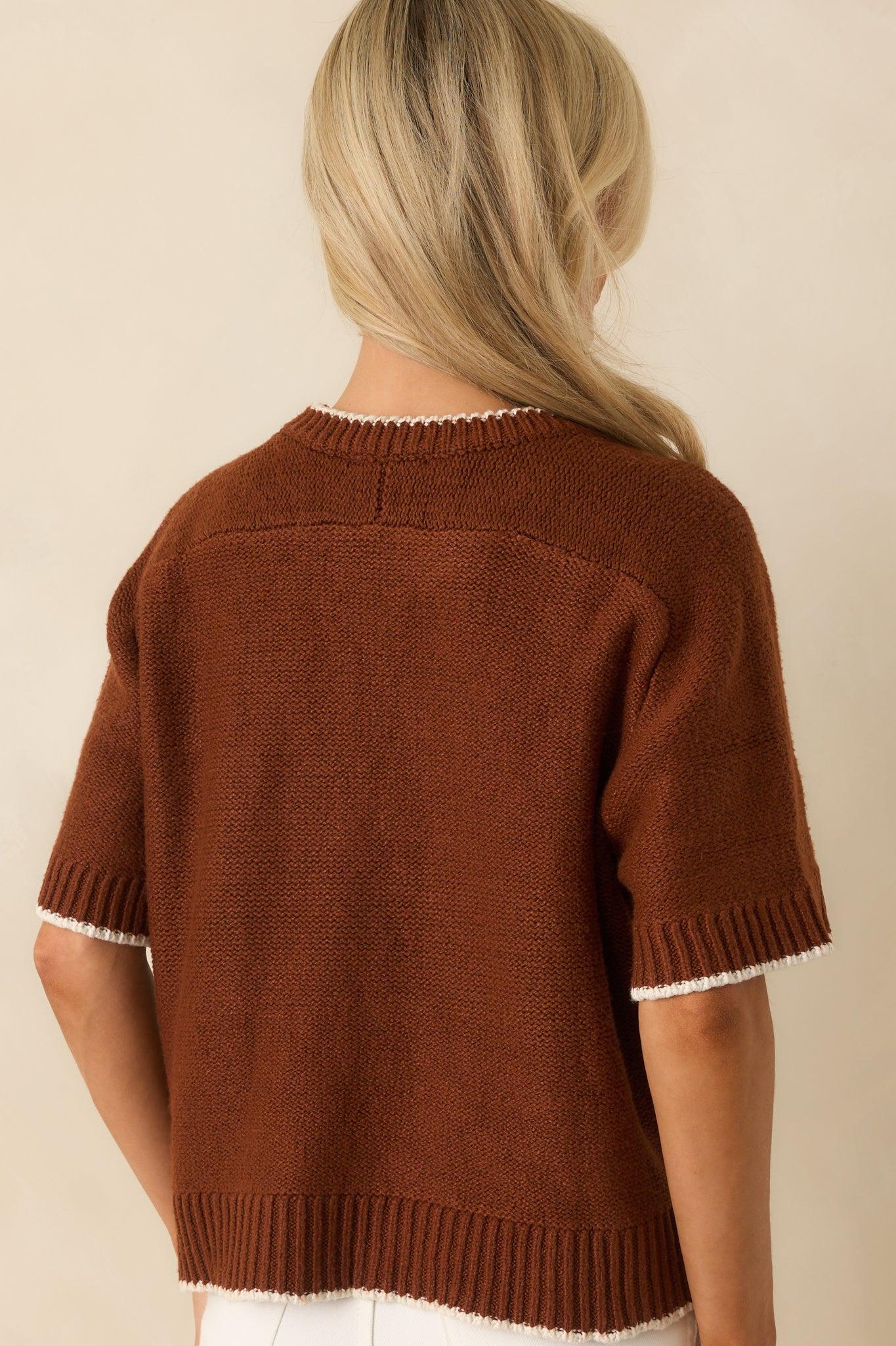 The Never Looked Back Brown Contrast Trim Short Sleeve Sweater is all about moving forward in style, giving you a fresh, confident look that feels just right for any day. This brown sweater features a crew neckline, an oversized fit, short sleeves, ivory contrast trim, ribbed hems, and a knit fabric. 100% Polyester Unlined Hand Wash Cold Manufactured in China Designed in the USA Model is 5'8" and wearing size small