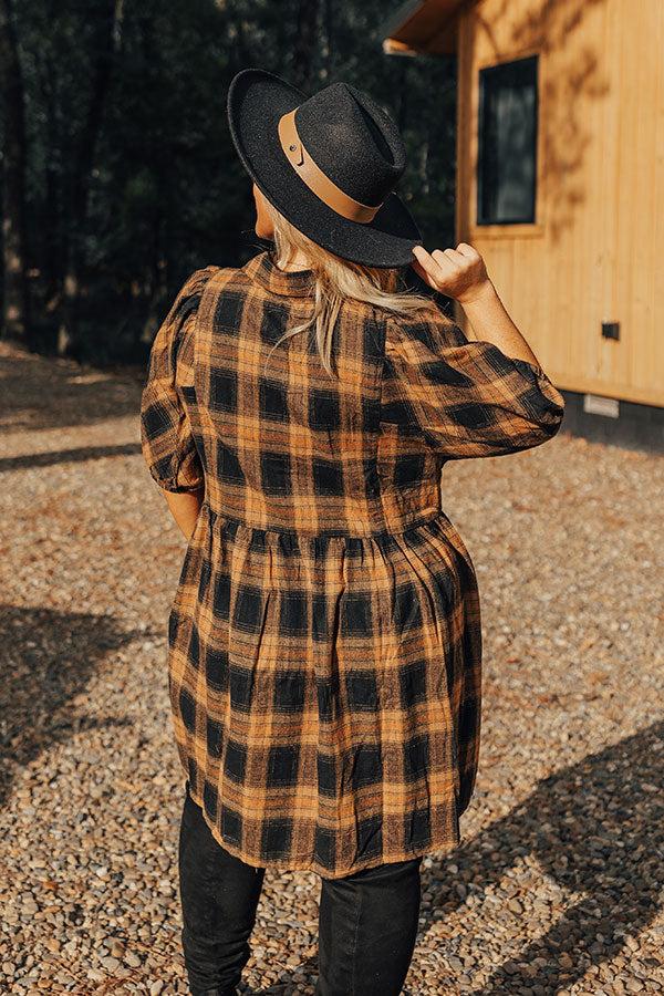 - This beautiful plaid dress has arrived just in time for cider season! - Unlined material with a plaid print - A collared neckline - A button-up front - Short sleeves with elastic cuffs - A relaxed silhouette that ends in a mid-thigh length hemline Measurements XL : Bust 44", Hip 52", Length 35.5", Sleeve Length 13.5", Waist 44". 1XL : Bust 46", Hip 54", Length 36", Sleeve Length 14.5", Waist 46". 2XL : Bust 48", Hip 56", Length 36", Sleeve Length 15", Waist 48".