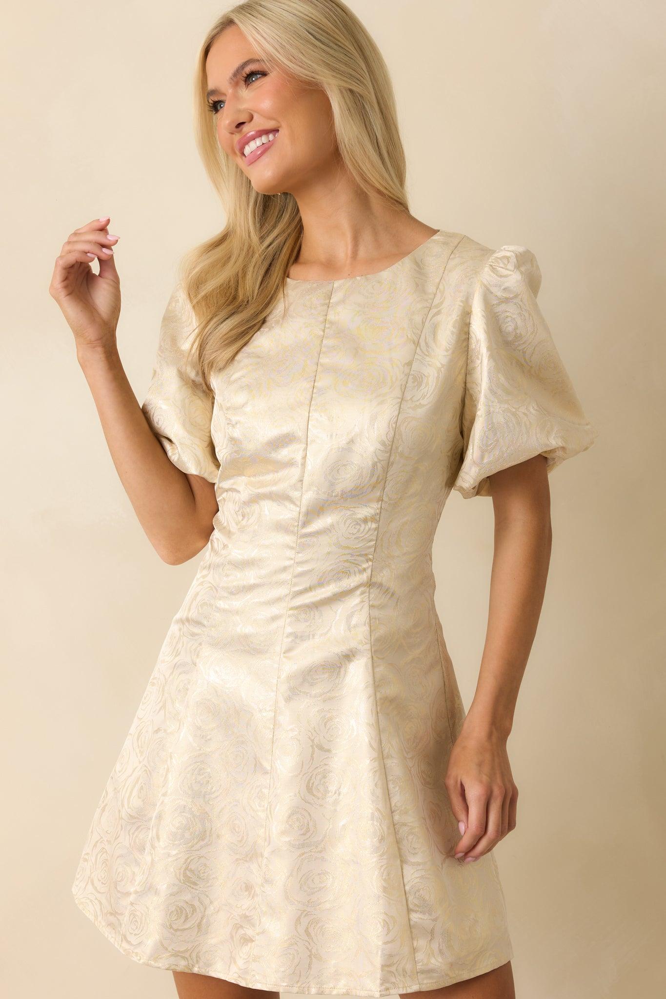 A moment of poise in every step — the Never Without Grace Champagne Floral Jacquard Mini Dress brings refined elegance to any occasion with its shimmering gold textured finish and timeless silhouette. Softly structured and endlessly flattering, it’s the definition of understated charm. This champagne floral jacquard mini dress features short puff sleeves, a fitted bodice with seam detailing, a subtle flared skirt, and a concealed back zipper, all crafted from structured woven fabric with full lining for a polished, elegant finish. 100% Polyester Lining: 95% Polyester & 5% Spandex Wash Cold Manufactured in China Designed in the USA Model is 5'8" and wearing size small, clipped, model is a true x-small