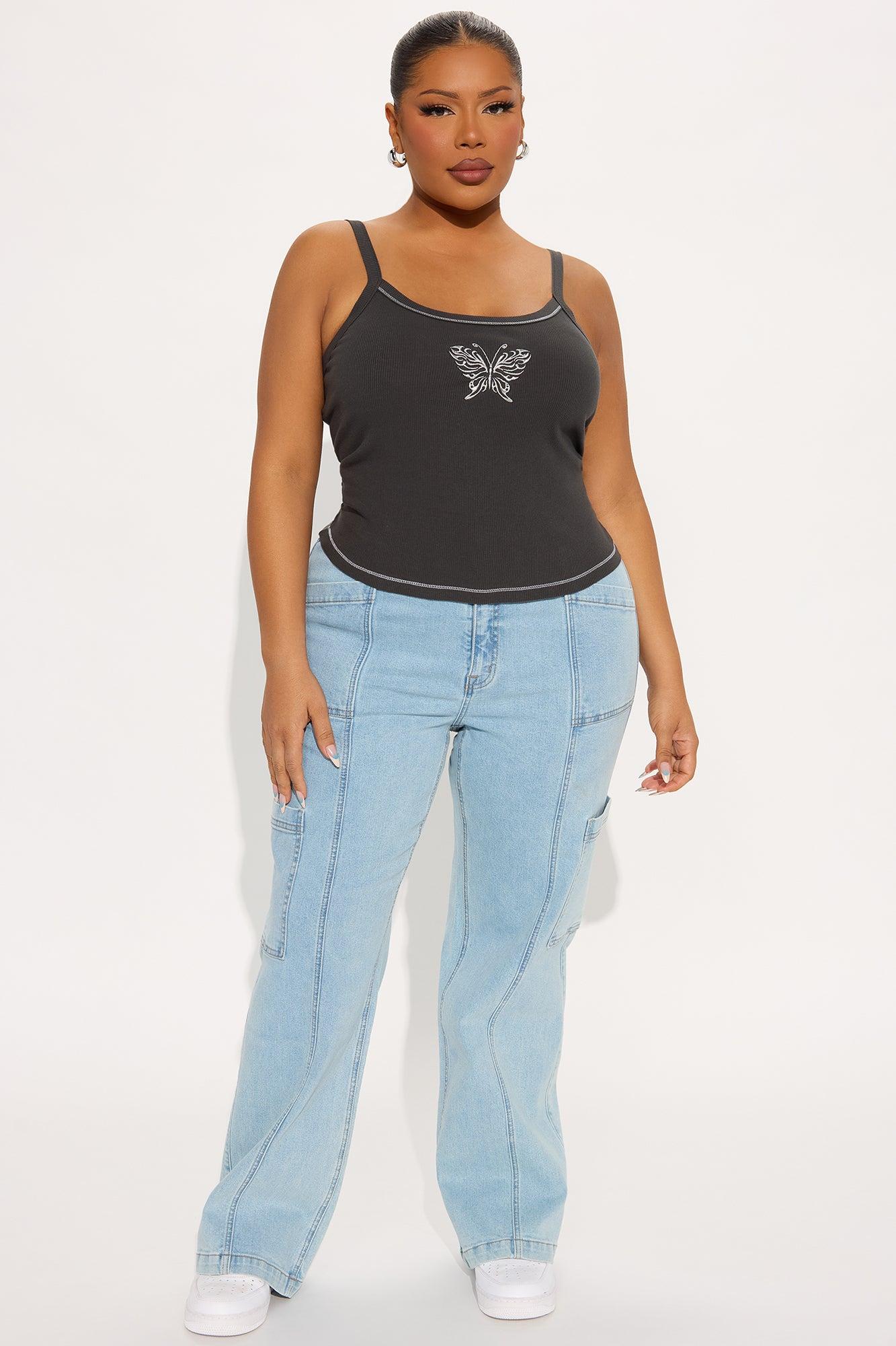 Available In Light Wash. Straight Leg Jean Cargo Pockets Seamed 10.5" High Rise 31" Inseam 98% Cotton 2% Spandex Medium Stretch Imported California Proposition 65WARNING: Cancer and Reproductive Harm - www.P65Warnings.ca.gov.