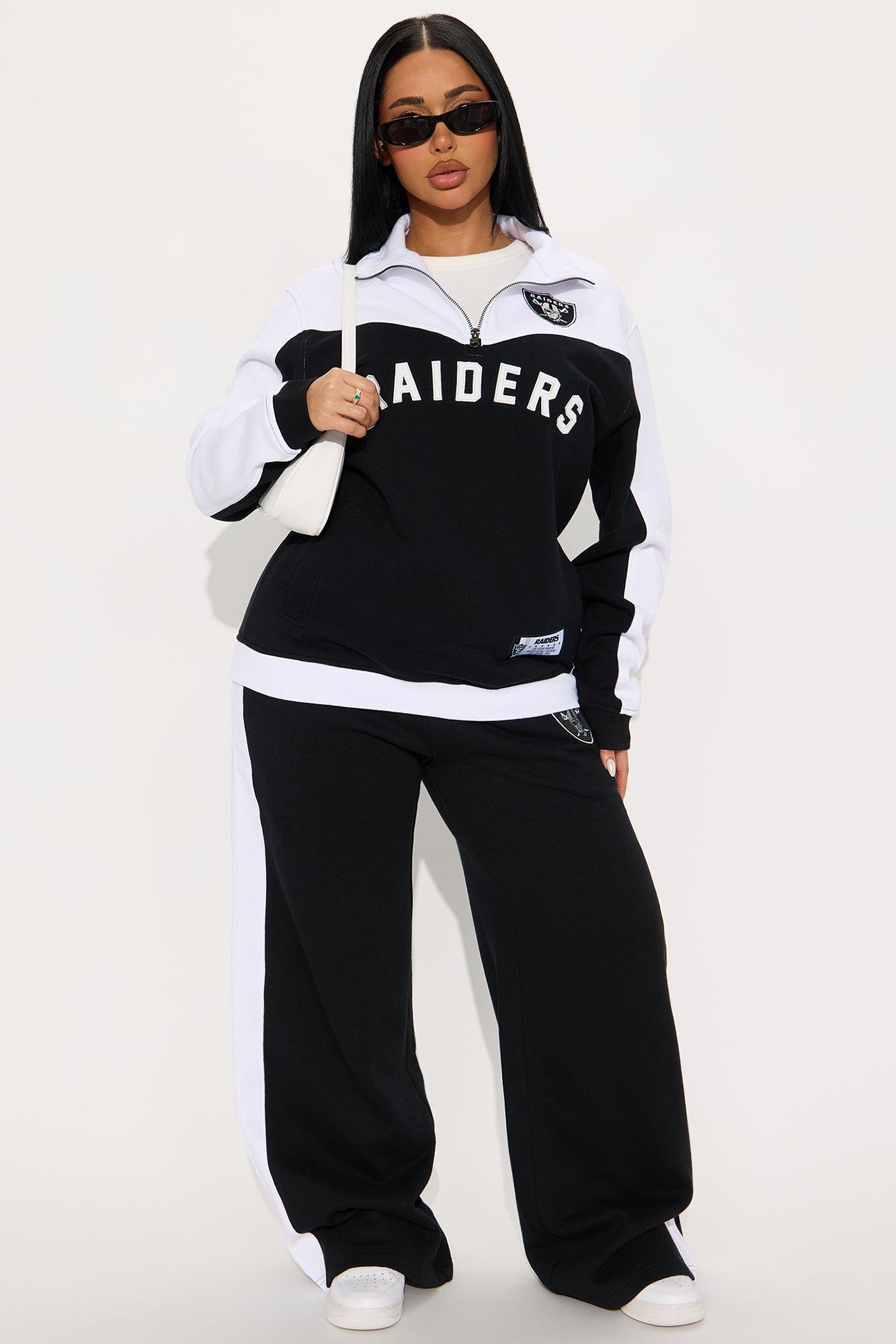 Available In Black. Sweatshirt Quarter Zip Long Sleeve Mock Neck Pockets Front And Back Embroidery Pair With "NFL Raiders Fleece Sweatpants" Self : 60% Cotton 40% Polyester Imported