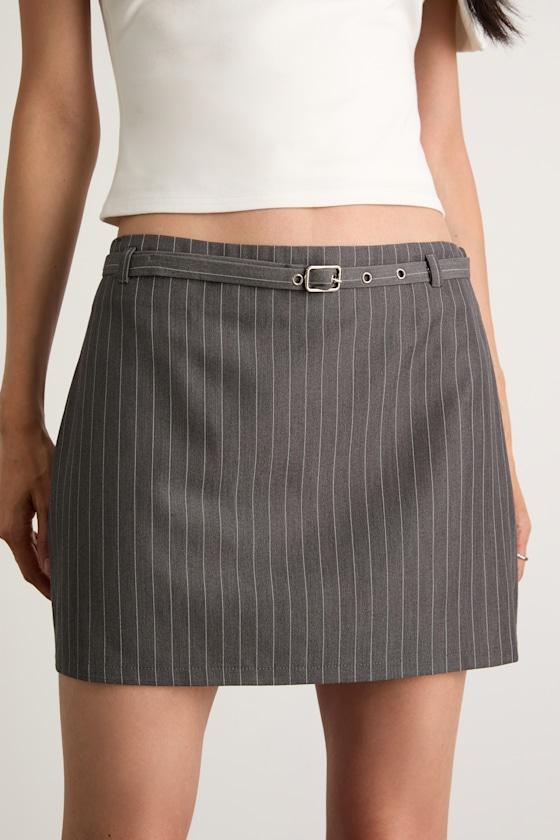 With a subtly sexy twist, this pinstriped mini skirt fits in at the office and then struts straight to happy hour. The coveted low-rise fit features a cute buckle belt with belt loops, while the figure-skimming silhouette finishes with a chic mini hem. Hidden side zipper/clasp.