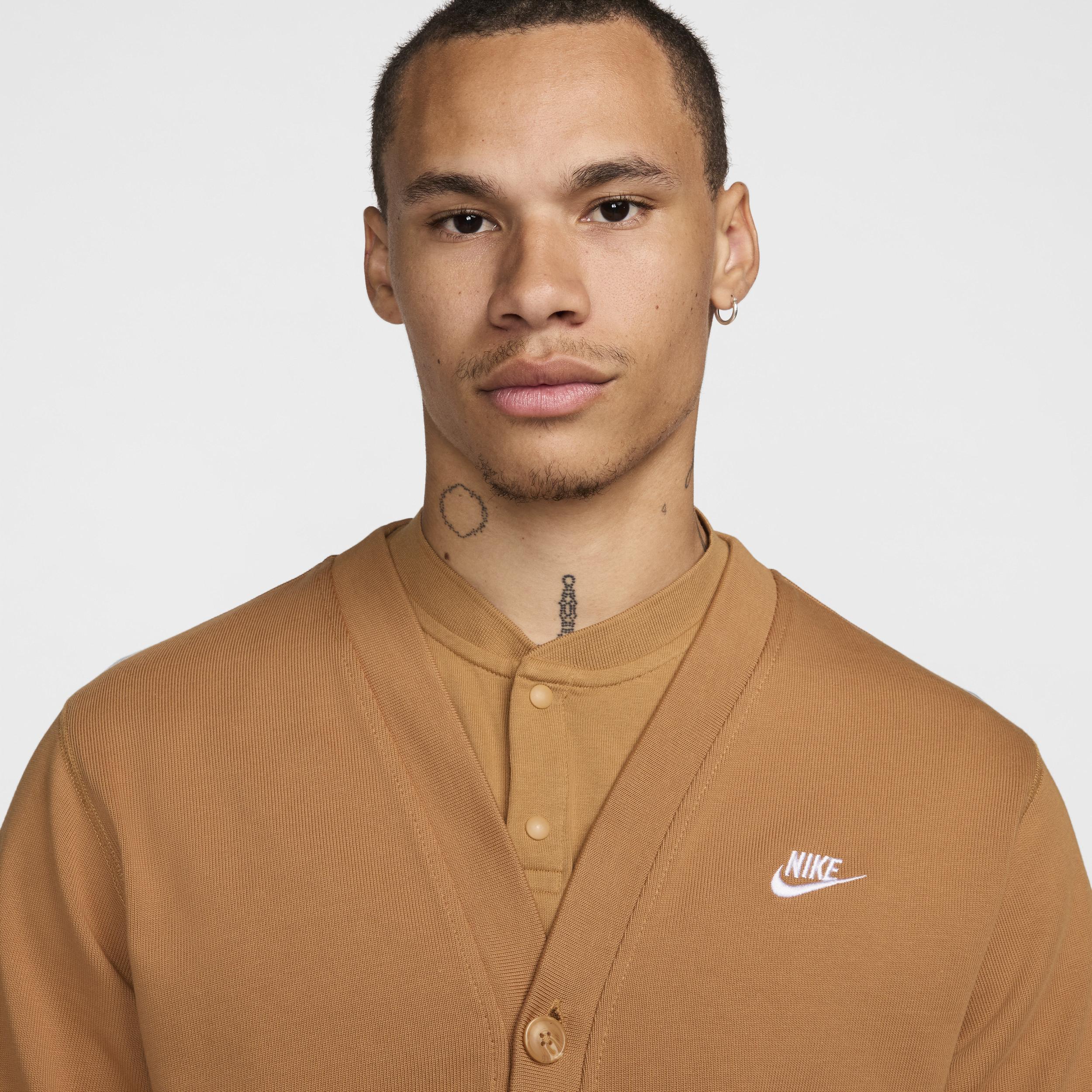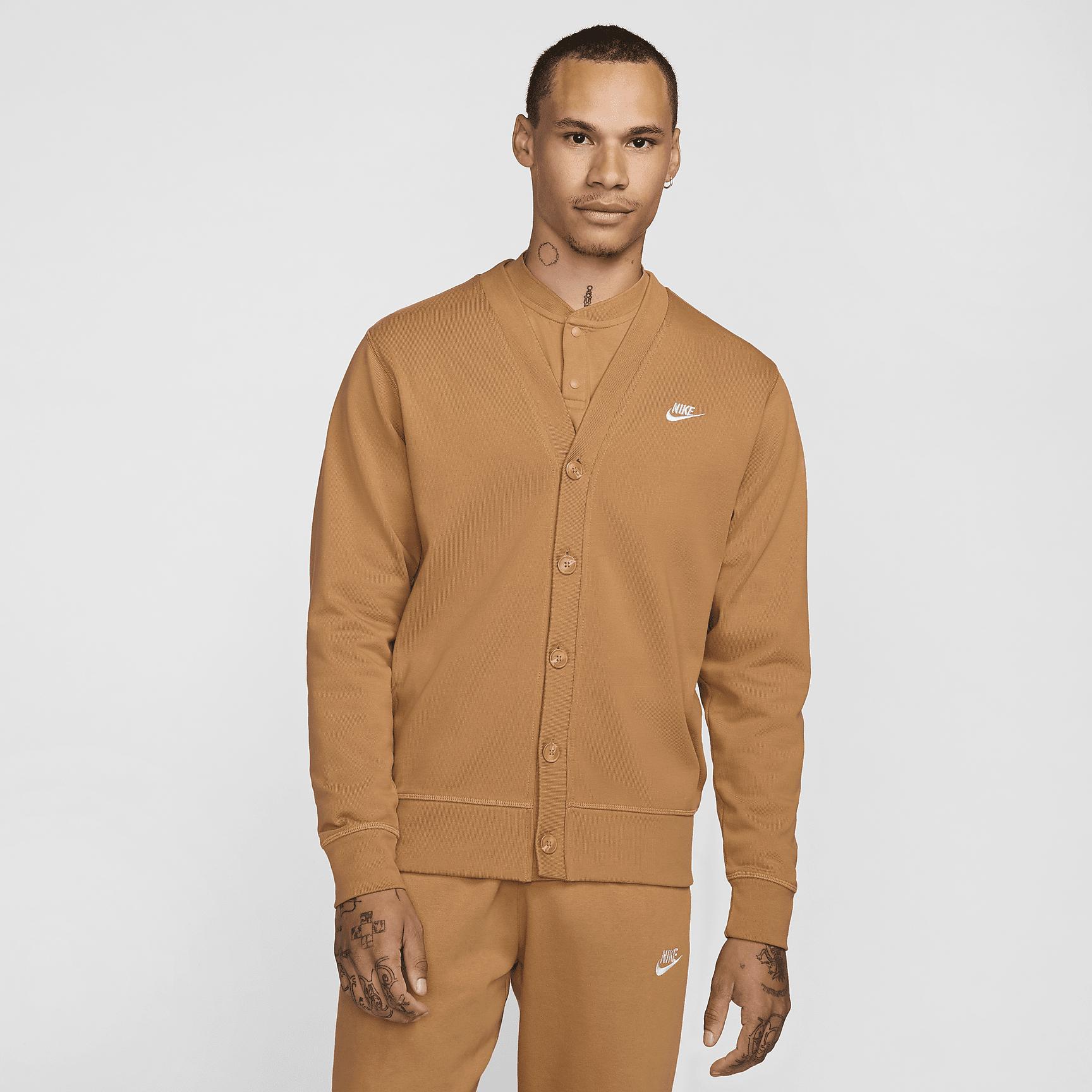 Comfort meets classic versatility with the Nike Club cardigan. Lightweight knit fabric feels extra soft and comfy, while the button placket and ribbed trim give your 'fit a polished look. Pull it on over a graphic tee for cafe cruising or pair it with an Oxford shirt for an evening out. Benefits:Lightweight knit fabric feels soft and comfortable for easy, daily wear. Designed to feel relaxed through the chest and body for an athletic fit you can layer. Button-down placket lets you change up your style and coverage. Product Details:Ribbed trim at collar, cuffs and hem. Embroidered Nike Futura logo at left chest. 100% cotton. Machine wash. Imported. Style: FN3898; Color: Flax/White; Size: 2XL; Gender: Male; Age Group: Adult | Nike Club Men's Knit Fairway Cardigan in Brown, Size: 2XL | FN3898-224