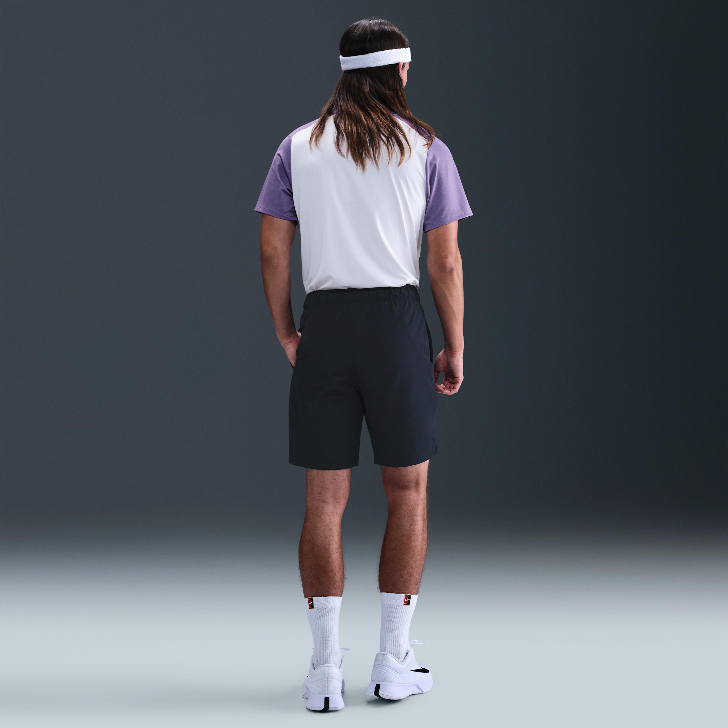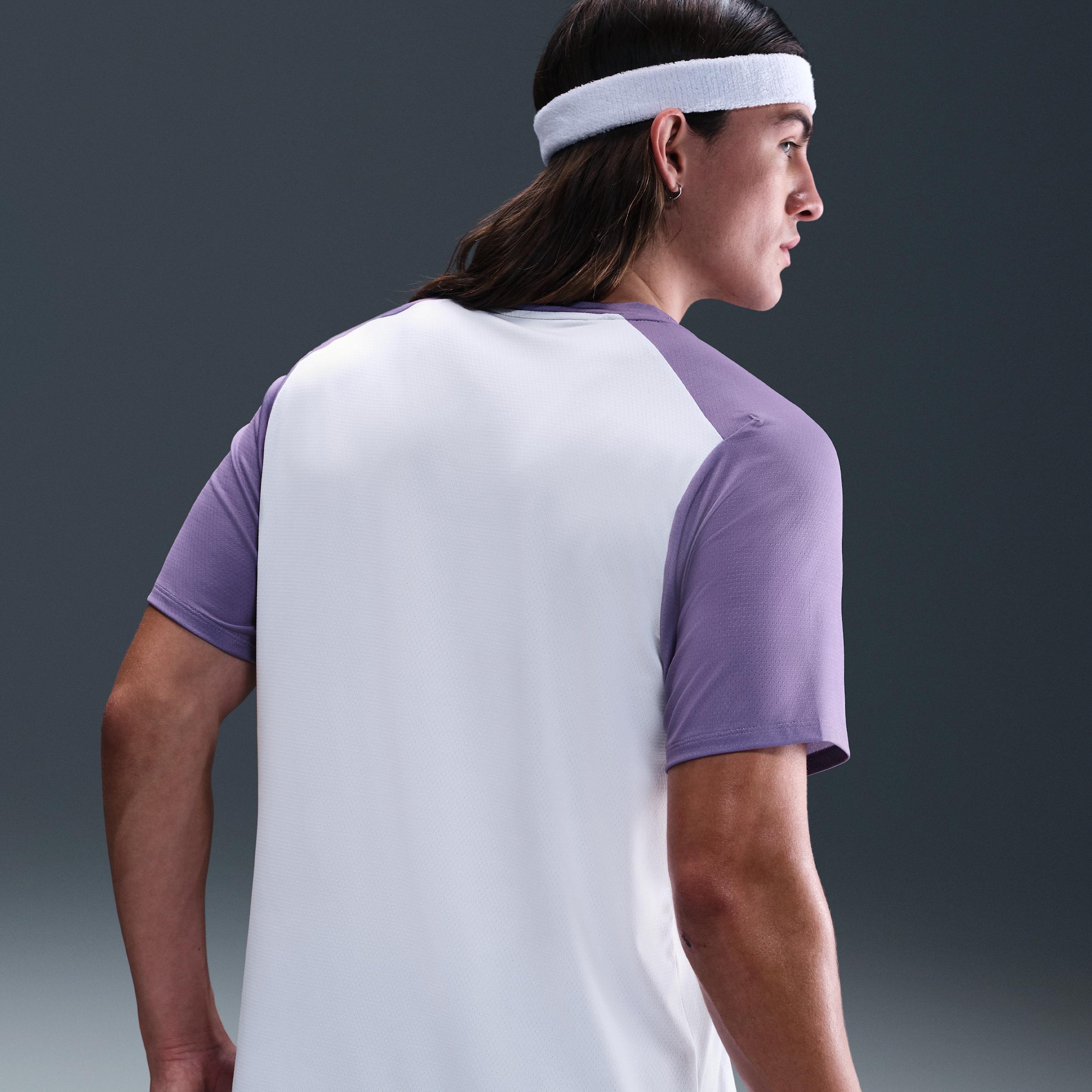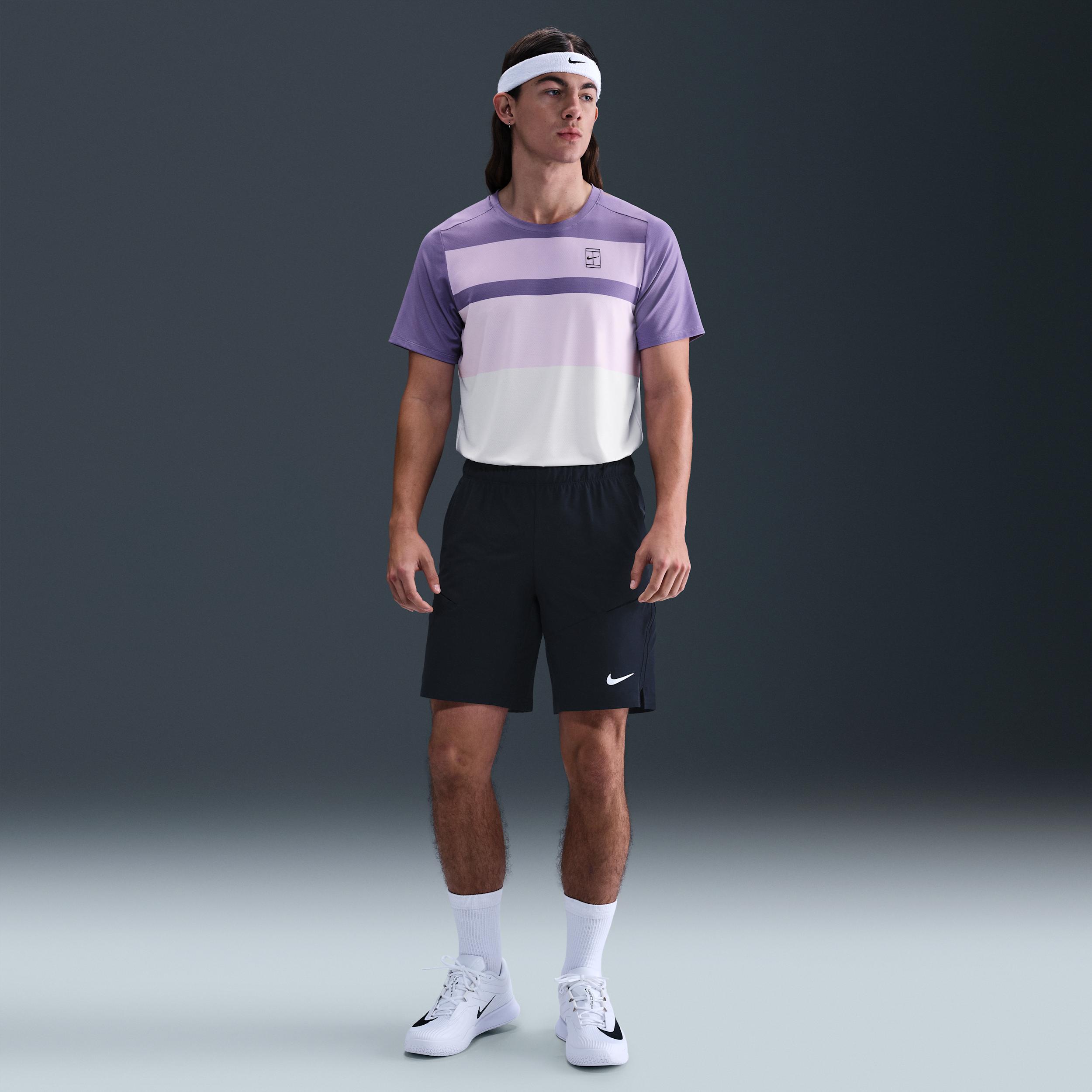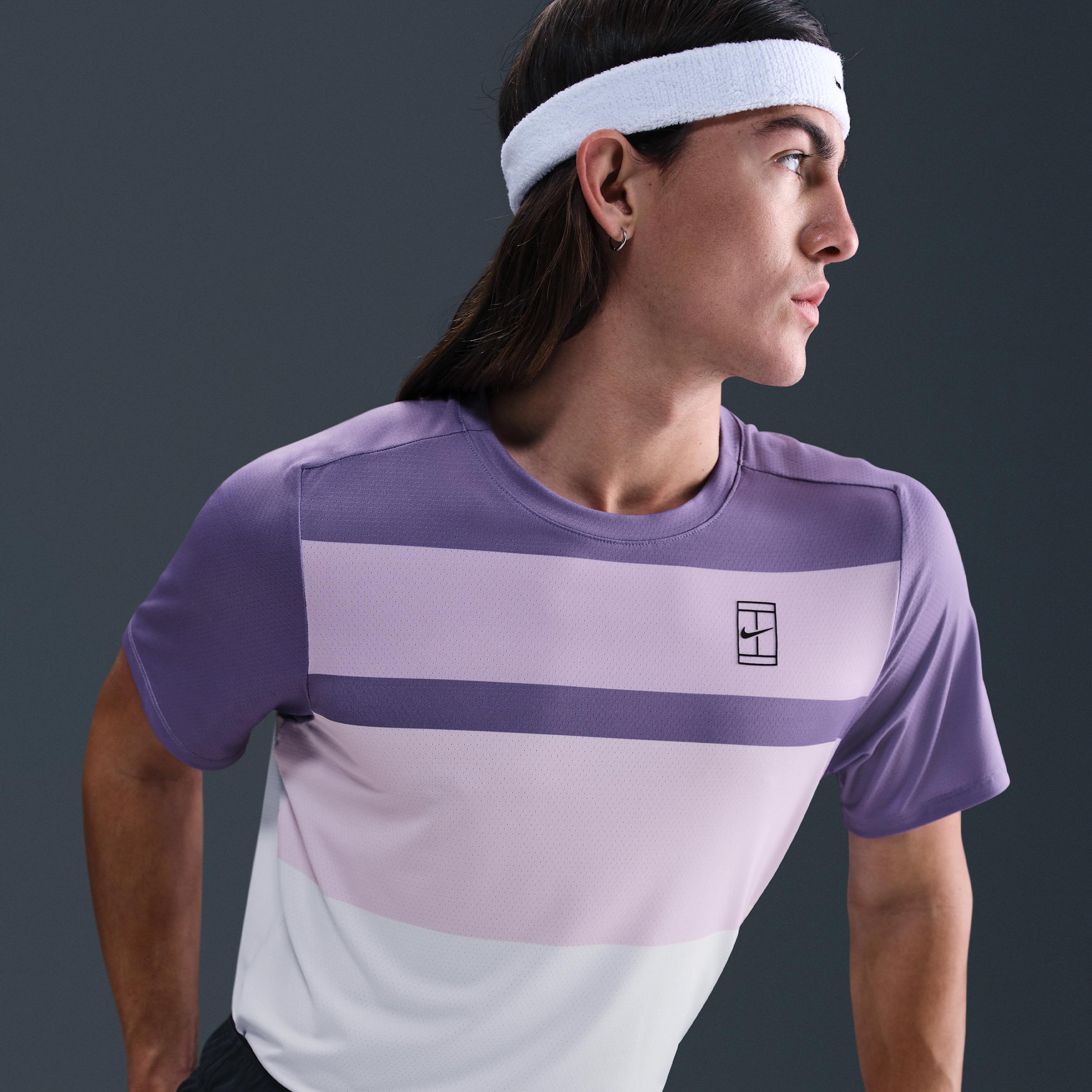 This slim-fit Advantage top lets you take the court with sweat-wicking, 4-way stretch material. The shoulder seam placement is designed to help you stay extra mobile while you rotate and drive through the ball. Benefits:Nike Dri-FIT technology moves sweat away from your skin for quicker evaporation, helping you stay dry and comfortable. Stretchy, breathable fabric feels light and limits cling to your body. The shoulder seam placement helps give you a smooth, natural feel through your swing. Longer back hem provides extra coverage. Product Details:NikeCourt logo. 89% polyester/11% spandex. Machine wash. Imported. Style: FZ9845; Color: Dusty Amethyst/White/Black; Size: 2XL; Gender: Male; Age Group: Adult | NikeCourt Advantage Mens Tennis Top in Purple, Size: 2XL | FZ9845-527