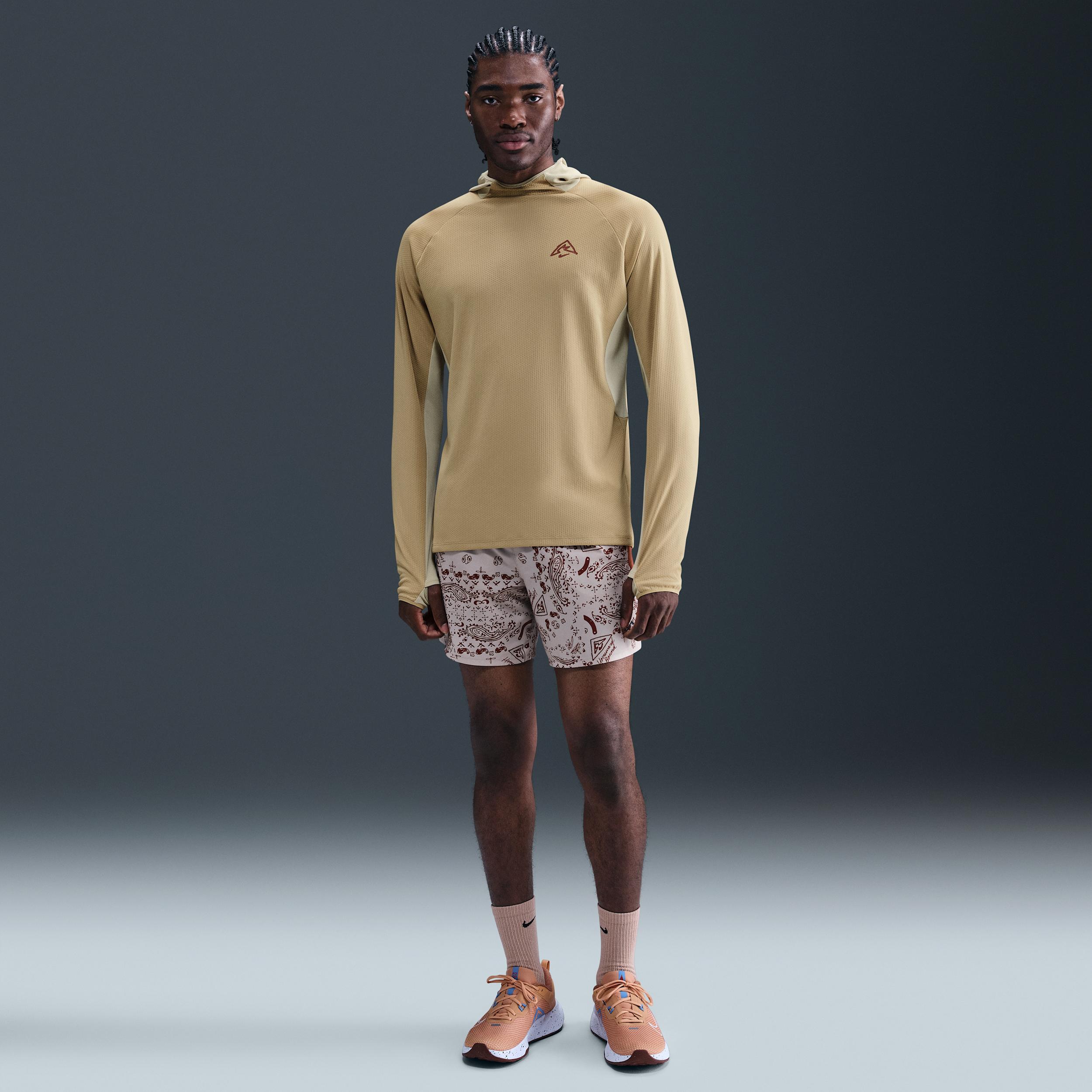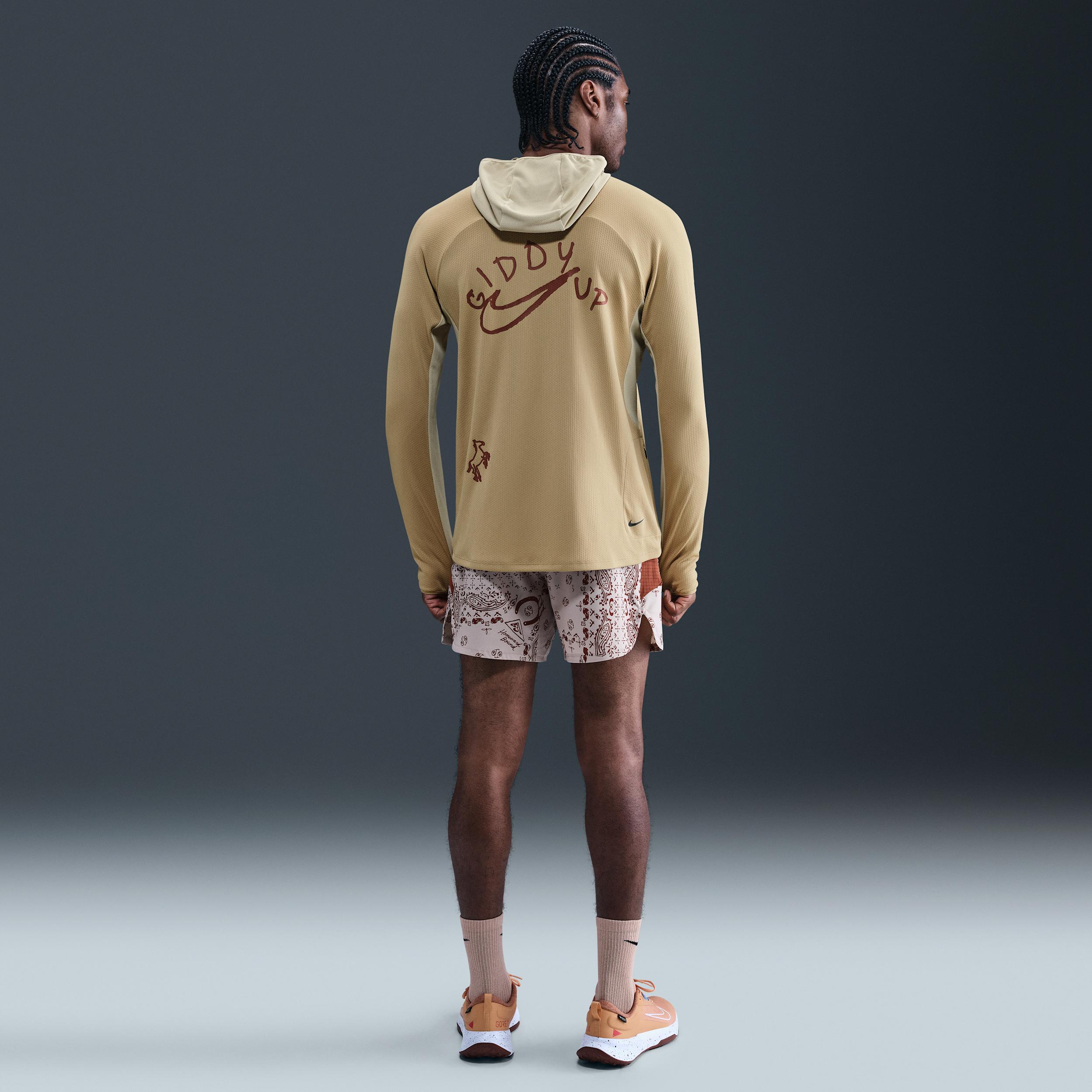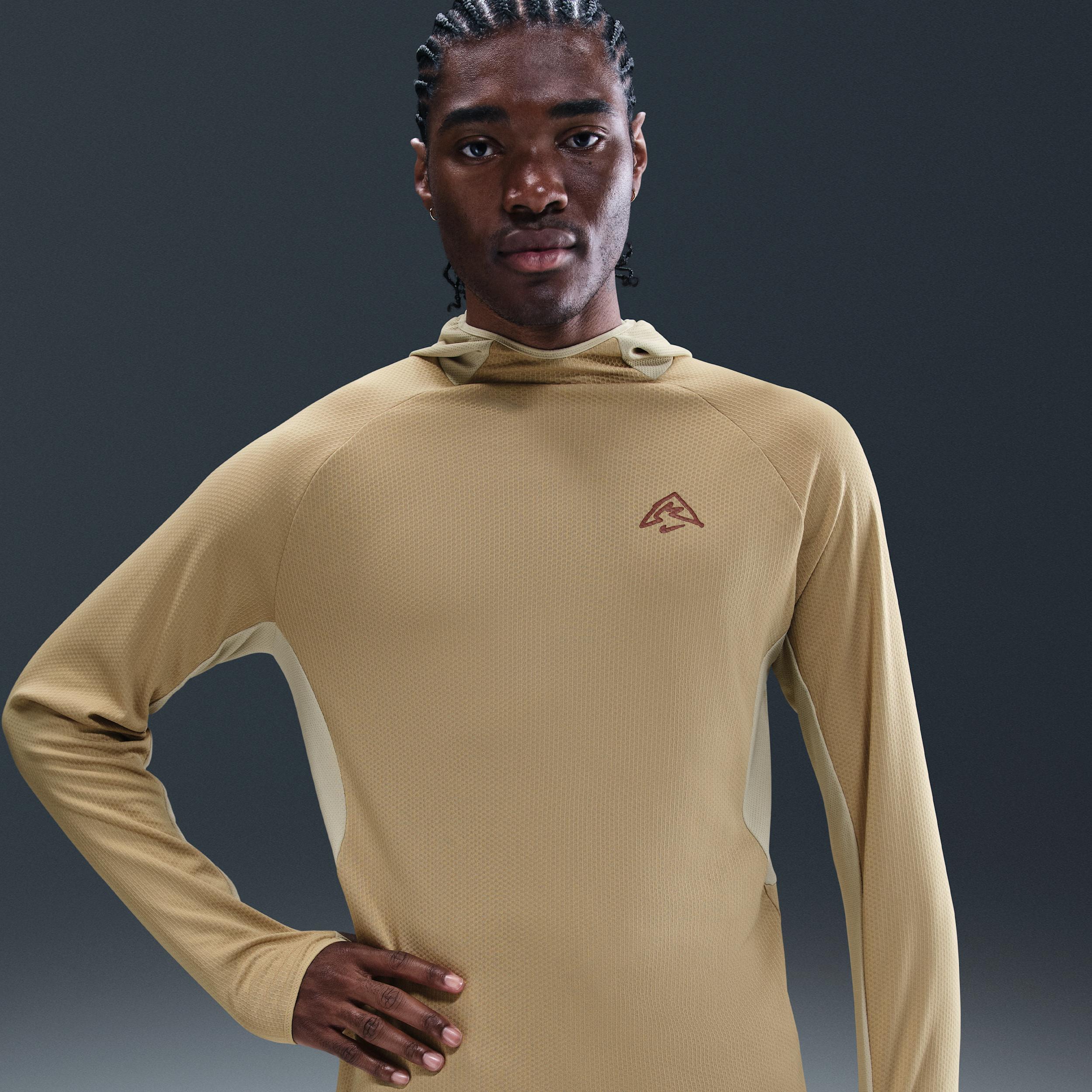 Nike Trail has the features to help make connecting with your surroundings easier, even in dynamic conditions. Built for trail running, this hooded top is built with sweat-wicking and breathable Dri-FIT fabric that also helps block UV rays. Benefits:Nike Dri-FIT technology moves sweat away from your skin for quicker evaporation, helping you stay dry and comfortable. Thumbholes let you extend your coverage and help hold the sleeves in place while you move. Back stash pocket holds your running essentials. This product provides UVA and UVB protection from the sun in the areas covered by the garment. To protect exposed areas, the use of good quality sunscreen is recommended. Product Details:100% polyester. Machine wash. Imported. Style: HJ4172; Color: Parachute Beige/Desert Khaki/Cinnamon; Size: M; Gender: Male; Age Group: Adult | Nike Men's Dri-FIT UV Hooded Running Top in Brown, Size: Medium | HJ4172-297