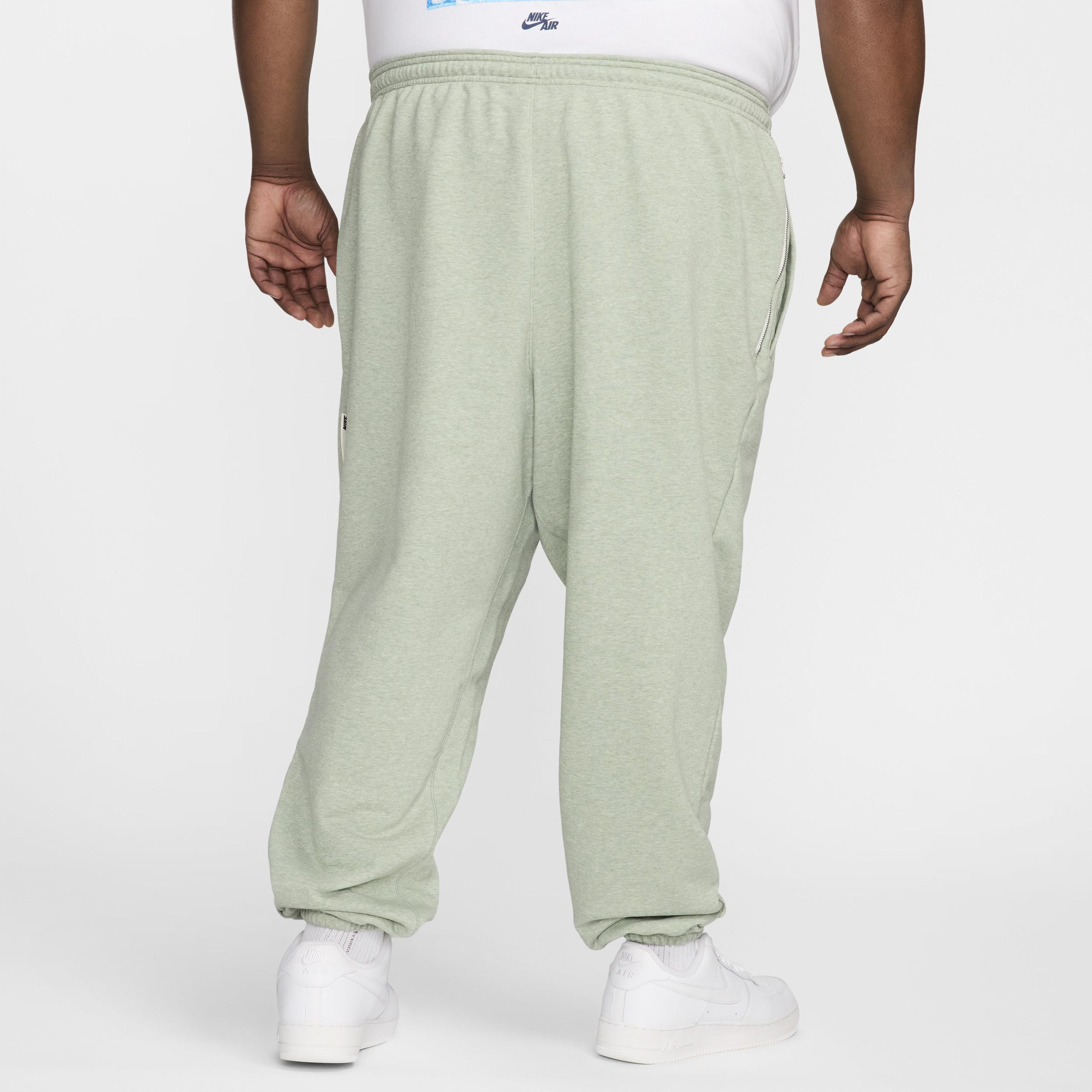With a classic fit and soft midweight knit fabric, these pants are all about versatility. Nike Dri-FIT technology moves sweat away from your skin for quicker evaporation, helping you stay dry and comfortable. Everyday Wear:Midweight French terry has a soft and structured feel that's comfortable on and off the court. Secure Storage:Zippered utility pocket stores your keys, cards or other small essentials. More Benefits:Pockets help keep your hands warm. Elastic waistband with drawcord provides a secure fit. Product Details:Elastic cuffs. "Standard Issue" woven label. 54% polyester/46% cotton. Machine wash. Imported. Style: FZ0224; Color: Jade Horizon/Heather/Pale Ivory; Size: XS; Gender: Male; Age Group: Adult | Nike Standard Issue Men's Dri-FIT Basketball Pants in Green, Size: XS | FZ0224-370