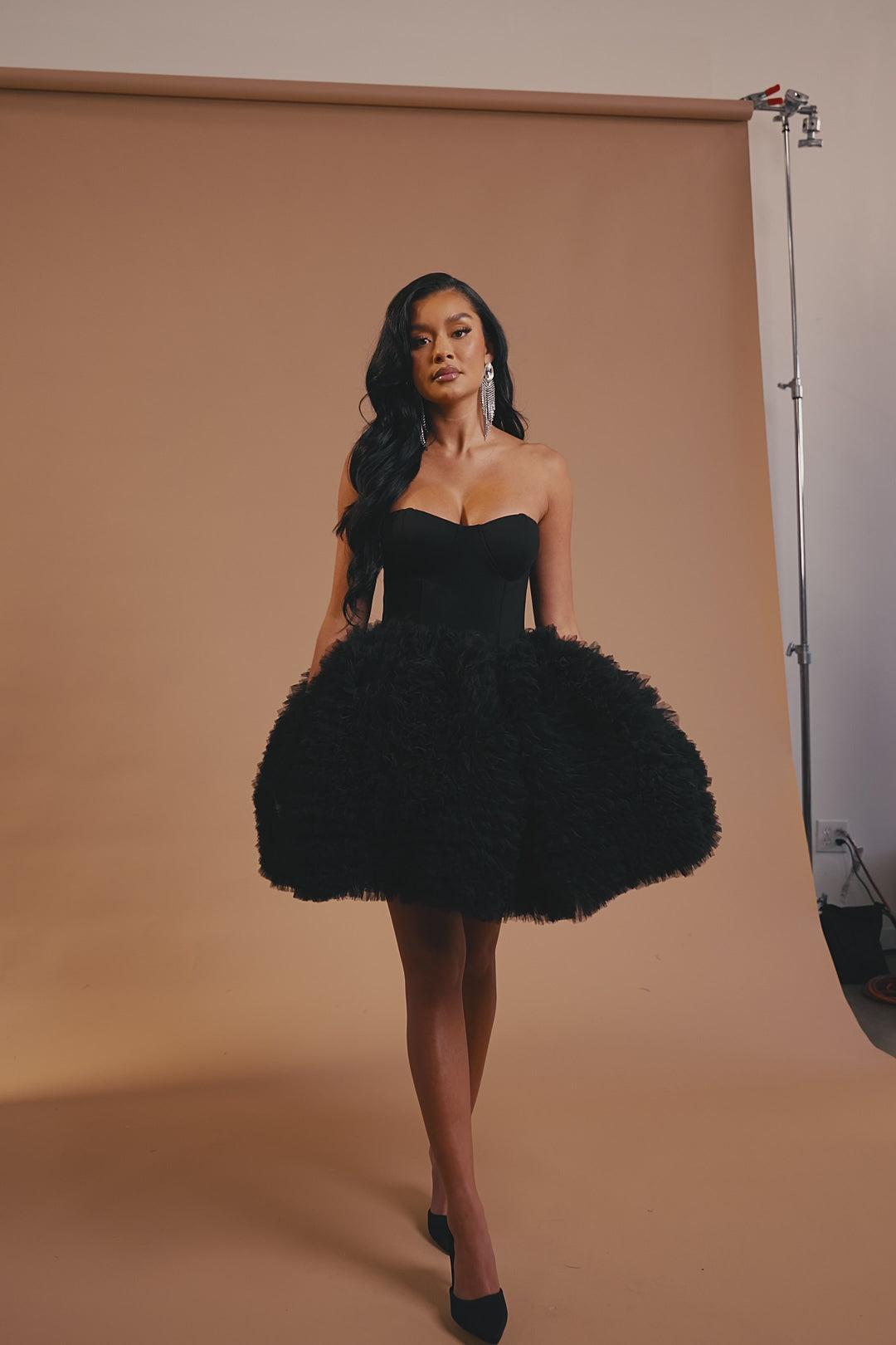 Available In Black And Pink. Ruffle Mini Dress Tube Sweetheart Neckline Padded Bra Cups Back Zipper Lined Slight Stretch Self 1: 65% Rayon 30% Nylon 5% Spandex Self 2: 100% Polyester Contrast:100% Polyester Lining : 95% Polyester 5% Spandex Imported