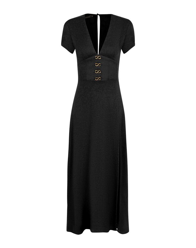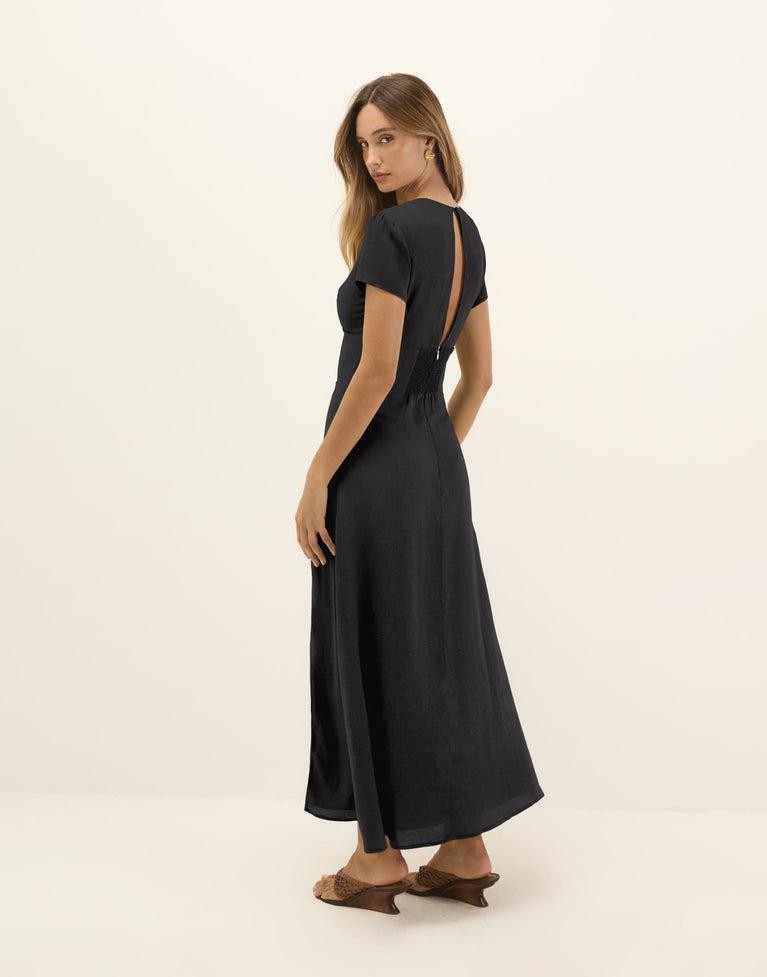 The ViX Nila Midi Dress features short sleeves, a plunging V-neckline, and structured internal boning for a subtle corset-inspired shape. The slightly flared skirt with a front slit flows effortlessly, while a smocked back and buttoned concealed zipper closure ensure a flattering fit. Style the Nila Midi Dress with san