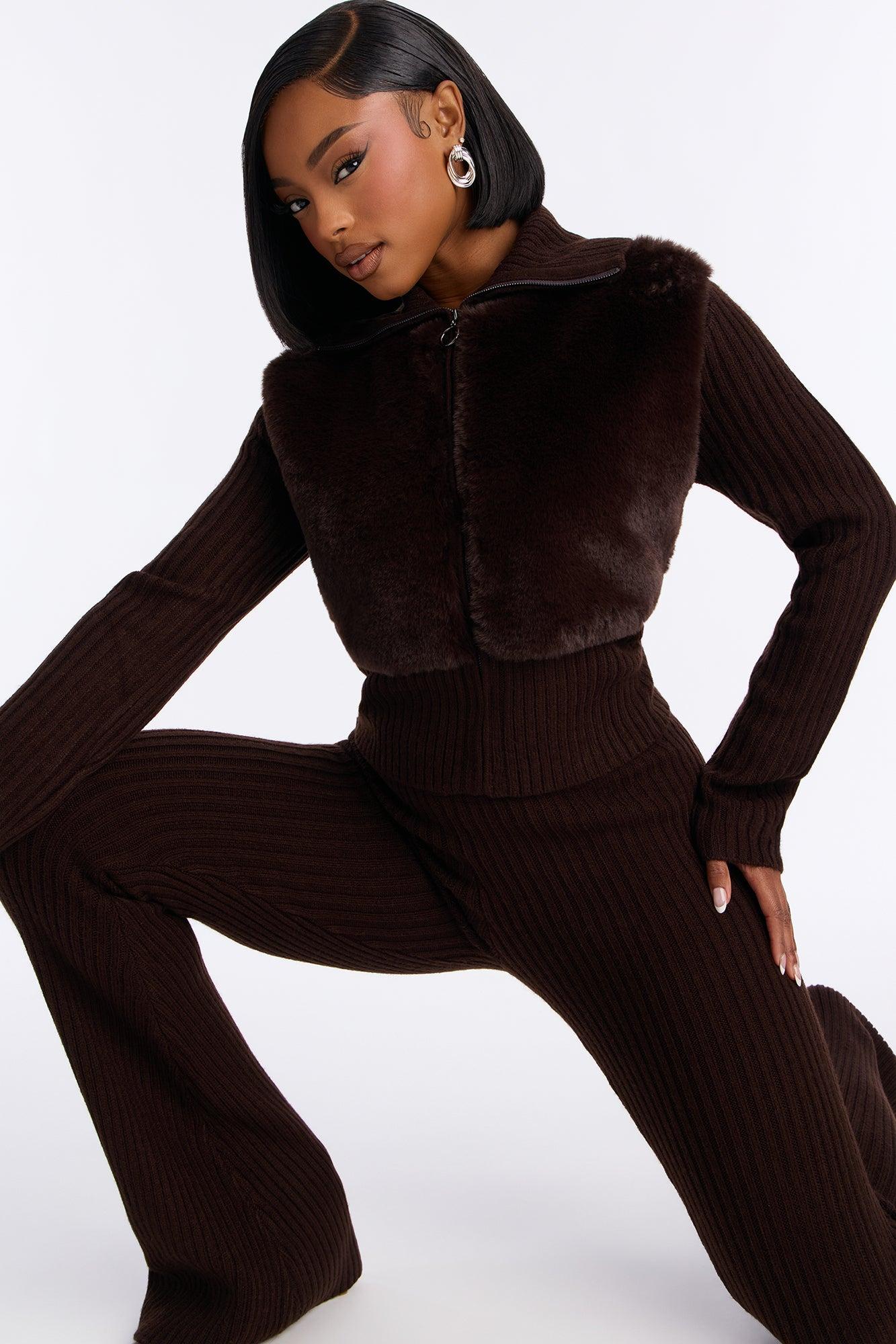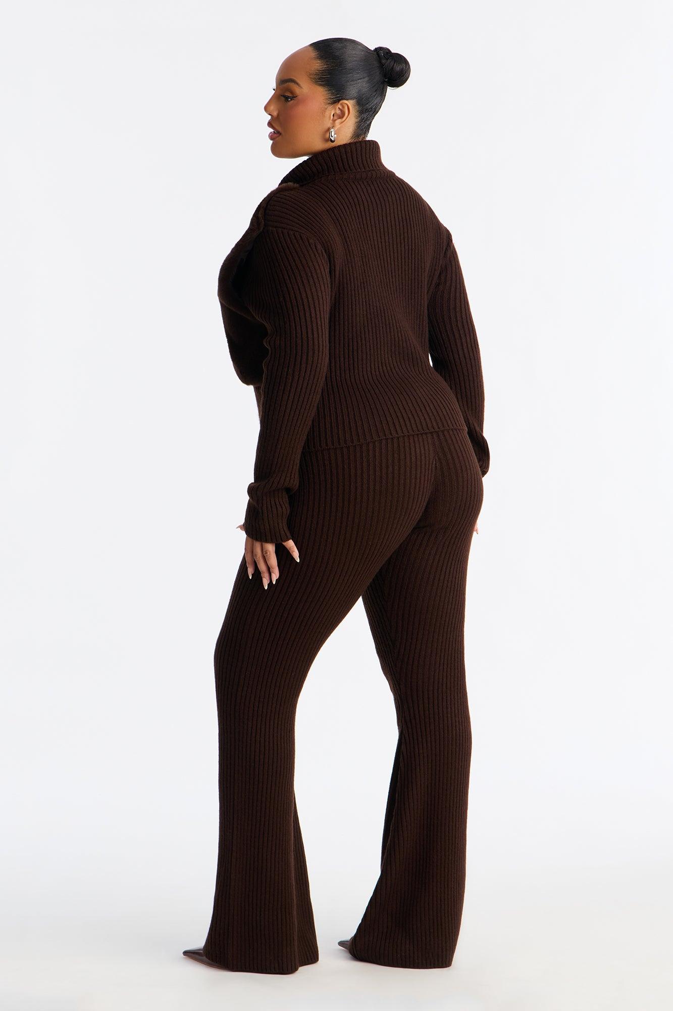 Available In Chocolate. 2 Piece Ensemble Long Sleeve Zip-Up And Flare Leg Pant Set Stretch Collar Neck Zip-Front Top Closure Flare Leg Elastic Waistband 35.5" Inseam Self : 95% Acrylic 5% Polyester Imported California Proposition 65WARNING: Cancer and Reproductive Harm - www.P65Warnings.ca.gov.
