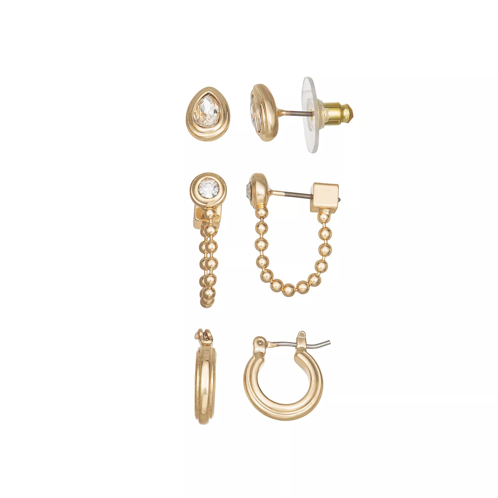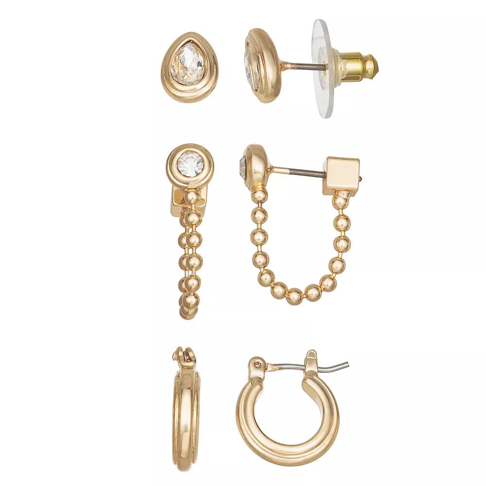 Accessorize in style with this Nine West gold tone crystal earring trio set. Click on this JEWELRY & WATCHES GUIDE to learn about fit, styles, materials and more! Accessorize in style with this Nine West gold tone crystal earring trio set. Click on this JEWELRY & WATCHES GUIDE to learn about fit, styles, materials and more! FEATURES Includes 3 pairs of earrings Dimensions: 44 mm x 6 mm Backings: post Nickel safe Metal: alloy Material: glass Plating: gold tone Finish: polished Not appropriate for children 14 years old and younger. Size: One Size. Gender: female. Age Group: adult.