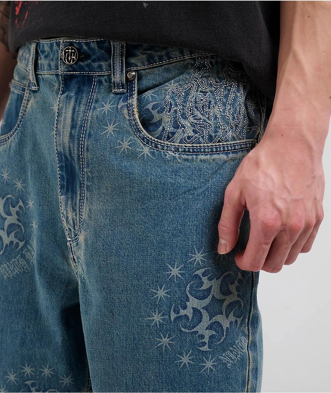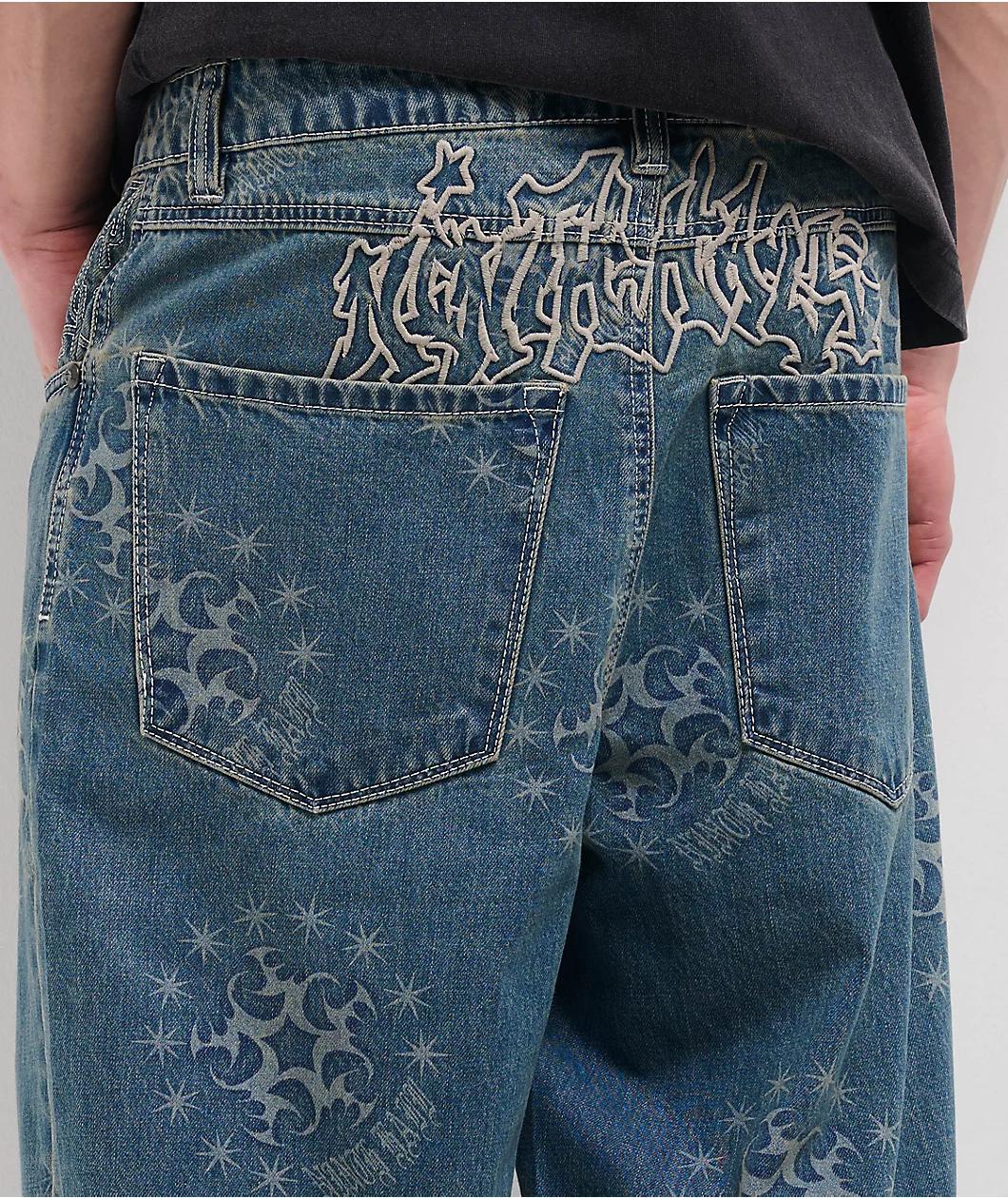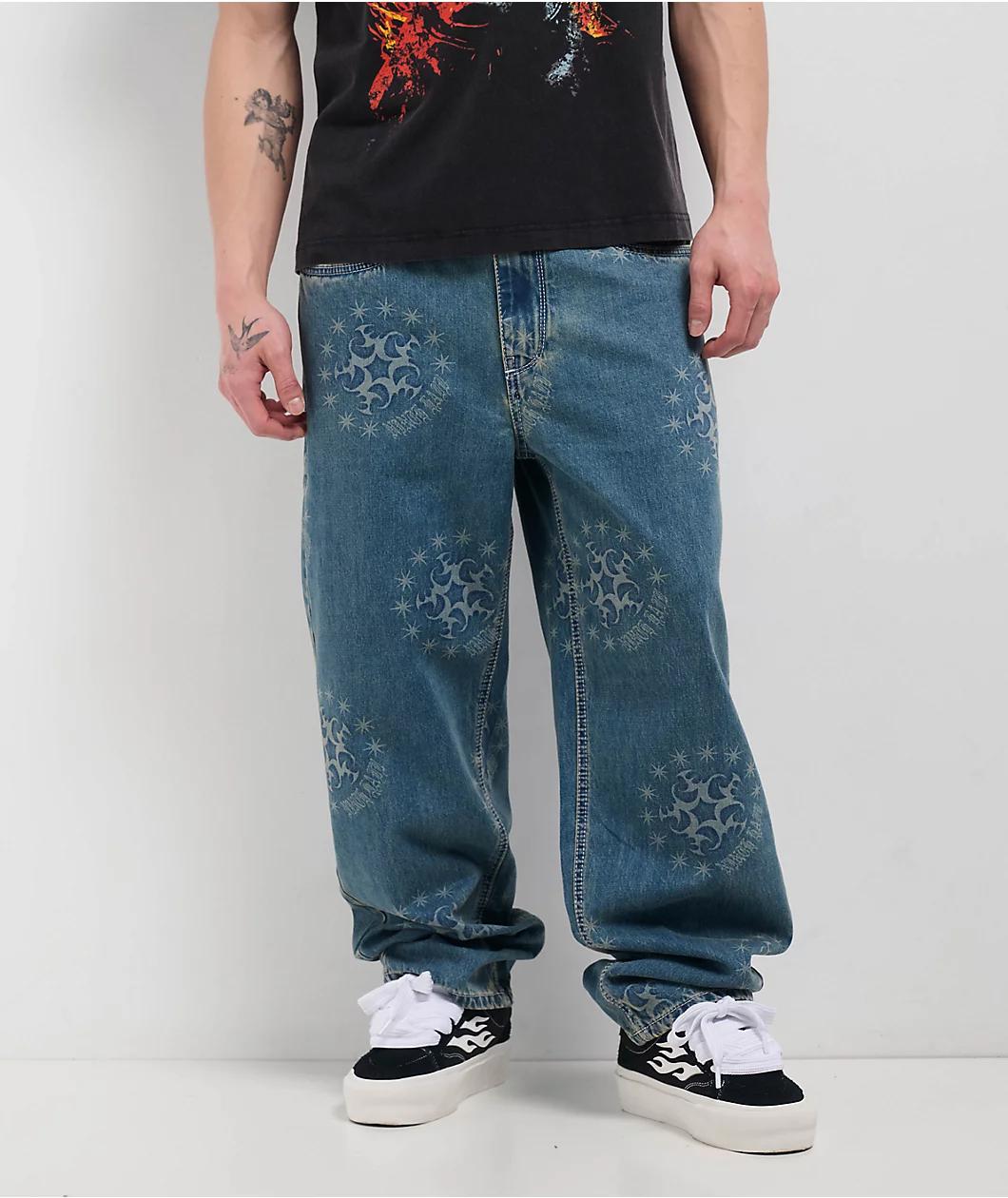 Provided by Ninth Hall in a classic blue denim construction with a washed treatment, the Ambush Star jeans offer a roomy, loose fit that tapers at the leg openings to prevent dragging or fraying. Sporting a unique printed graphic pattern throughout o