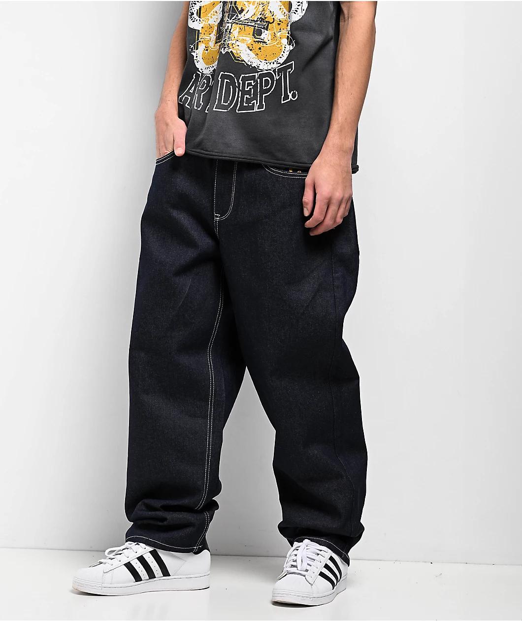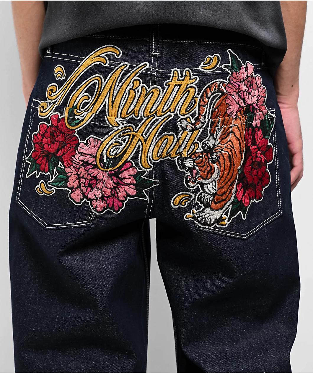 Landing in a dark "Raw Indigo" wash, the Ambush Tiger jeans from Ninth Hall have a casual, relaxed look. Embroidery featuring yellow branding text, pink flowers, and a fierce tiger adds a pop of color to the back where it decorates the waist and seat