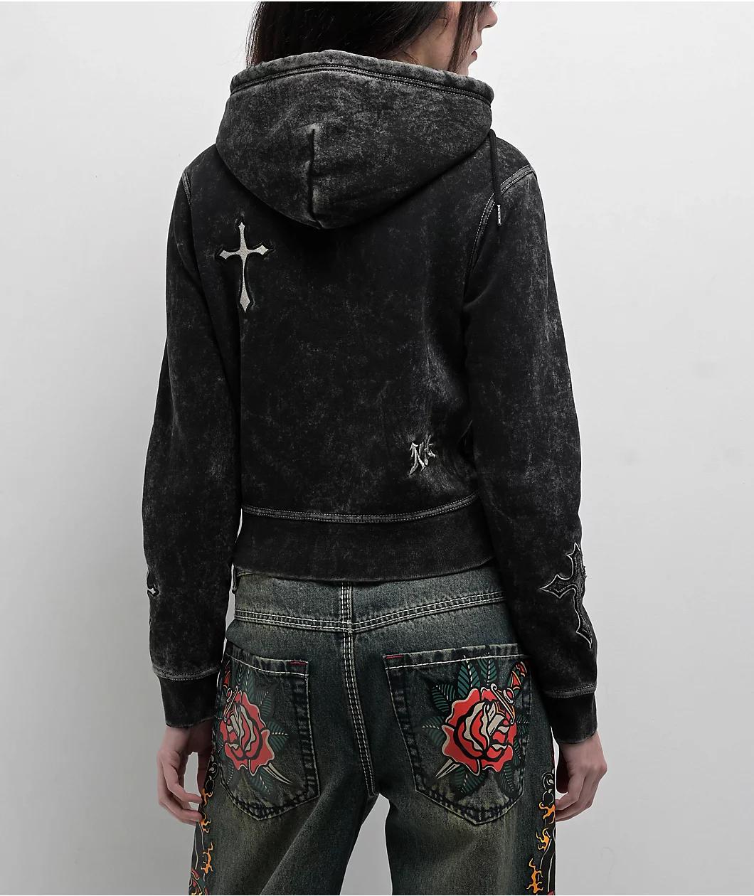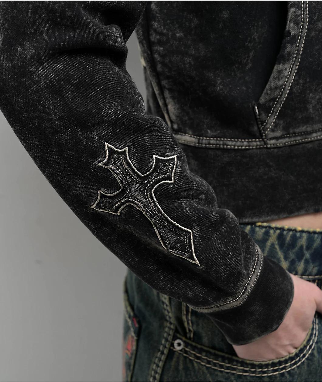 The folks at Ninth Hall welcome the Andover Cross hoodie in a washed black cotton blend with embroidered graphics and a full zip closure. The sweatshirt provides a religious vibe with embroidered crucifixes on the front, back and sleeves while subtle