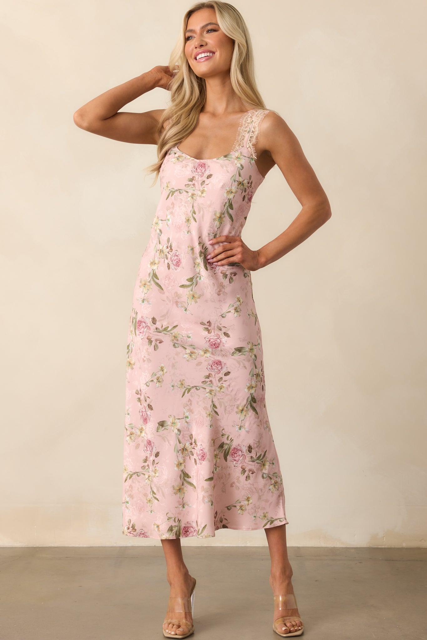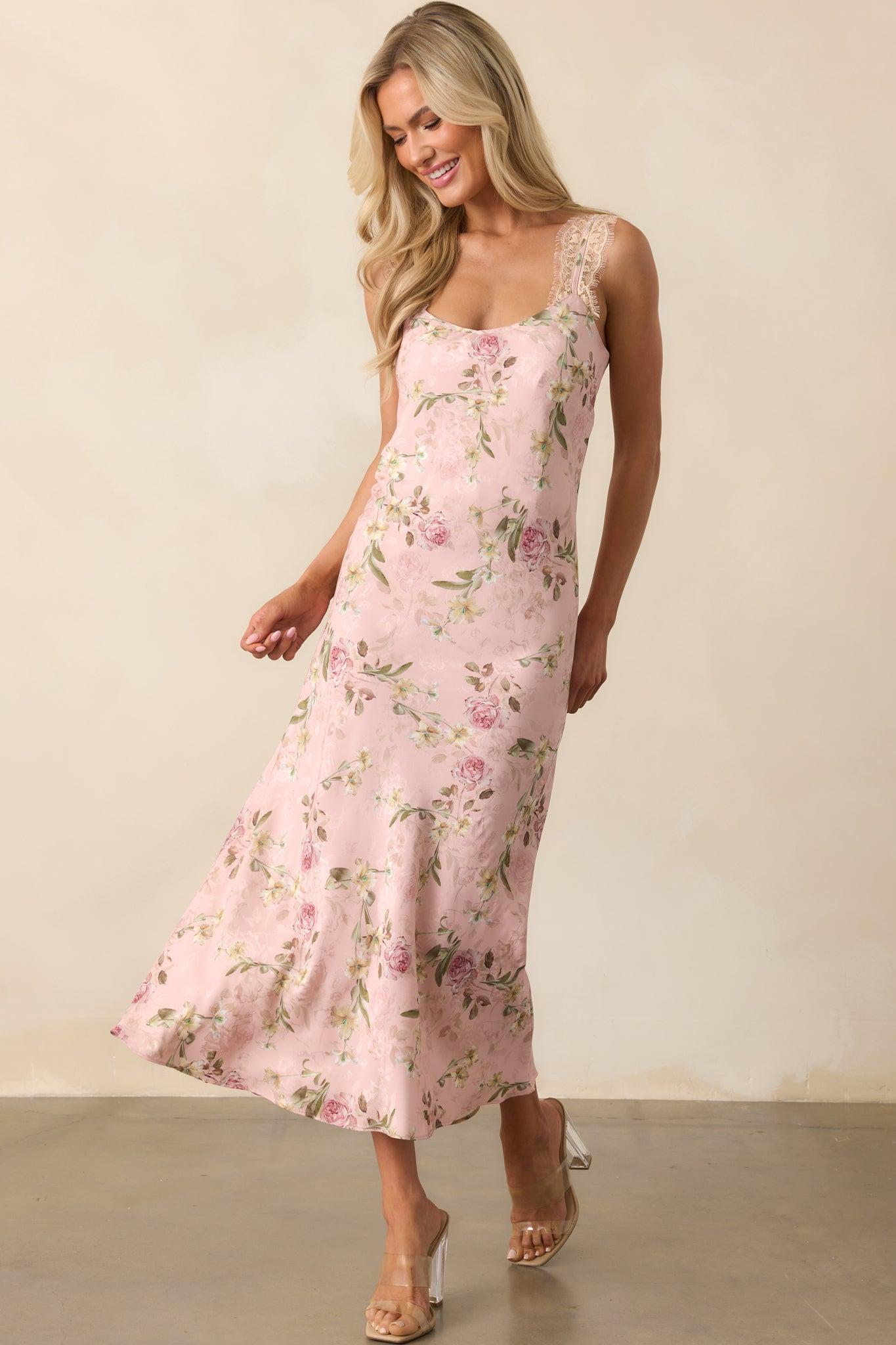 The Nobody Like Me Rose Pink Floral Jacquard Maxi Dress captures a sense of quiet confidence and timeless grace. Perfect for occasions when you want to feel effortlessly elegant and uniquely yourself. This rose pink dress features a floral jacquard fabric, a printed floral print, scoop neckline, adjustable lace trimmed straps, an open adjustable lace-up back, and a slip silhouette.