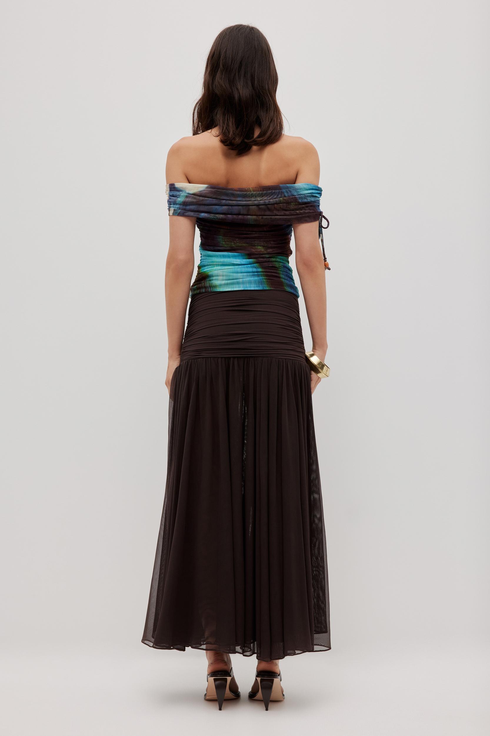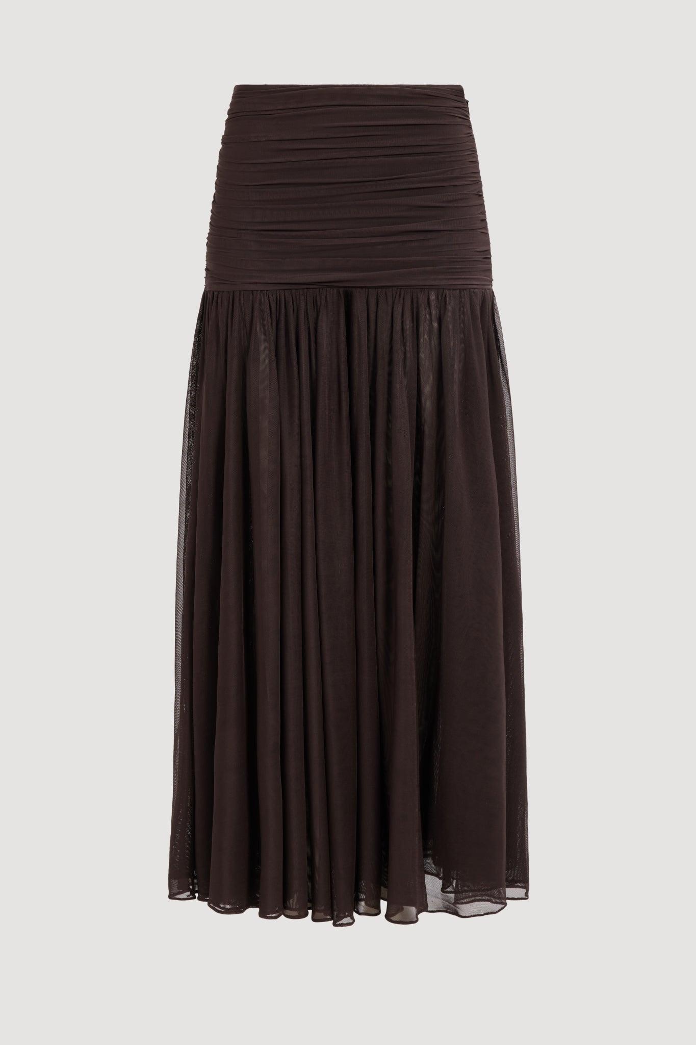 PRODUCT DETAILS Maxi skirt Side tie detail with drawcords and resin bead detail Fitted at waist Dropped waist Full gathered skirt Mesh lined Grip/jelly tape at neck edge for support 95% Polyester, 5% Elastane Dry Clean Only Shop All Skirts SIZE AND FIT Model wears a size 8/S Model: 179cm/ 5’10 Bust: 82cm Waist: 64cm Hips: 88cm
