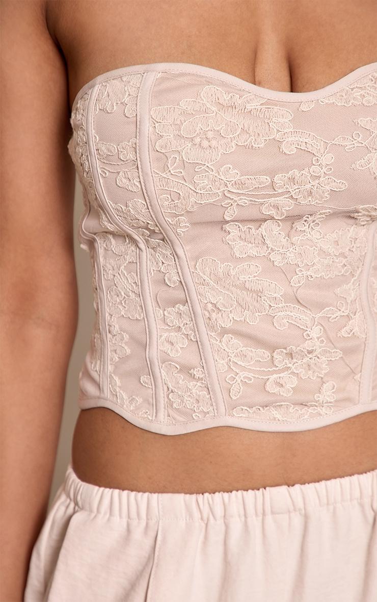 Reimagine evening style with an artful edge. The nude textured lace back corset delivers a refined silhouette with its confident strapless neckline and intricate textured lace overlay, designed with internal boning for a sculpted form and an adaptable lace-up fastening at the back, championing an elevated aesthetic. Pair this essential with high-waisted tailored pants or a sleek midi skirt, grounding the look with sharp mule heels. Complete your confident ensemble with elegant pearl earrings for a sophisticated, undeniable presence.Length approx 34.5cm/13.5inch (Based on sample size US 4)Model wears size UK 8/ EU 36/ AUS 8/ US 4Model Height - 5ft 9inchp]:!mb-4inch>Brand: PrettyLittleThingCategory: TopsProduct type: CorsetColor: NudeMaterial: Woven LaceOccasion: Evening
