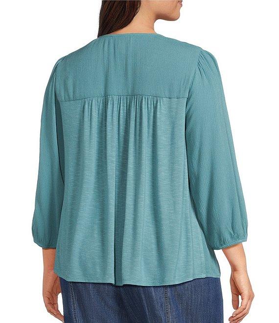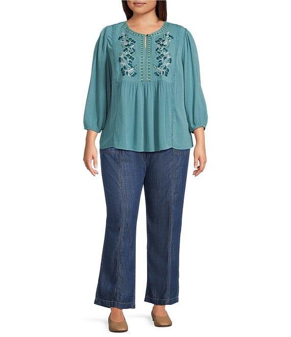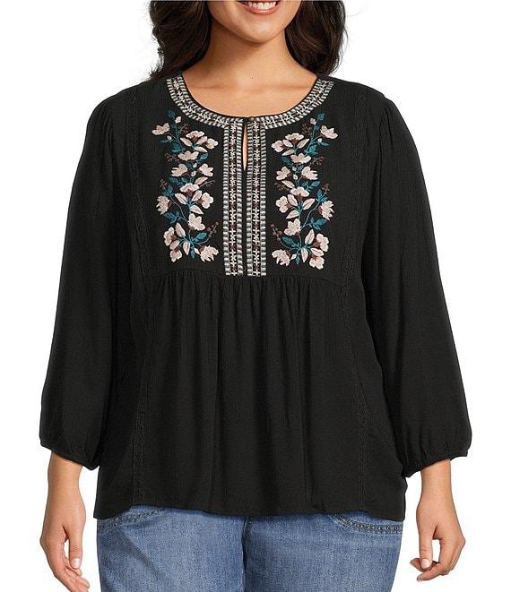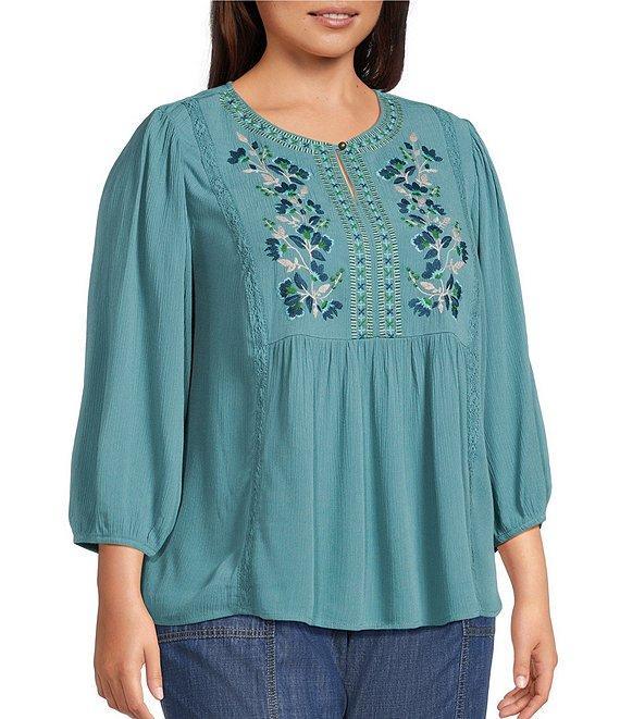 Nurture Plus Size 3/4 Sleeve Keyhole Neck Embroidered Square Yoke Top