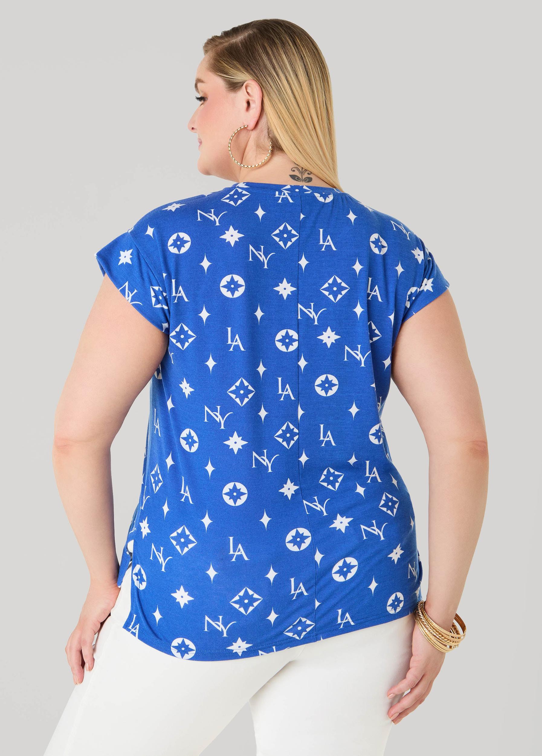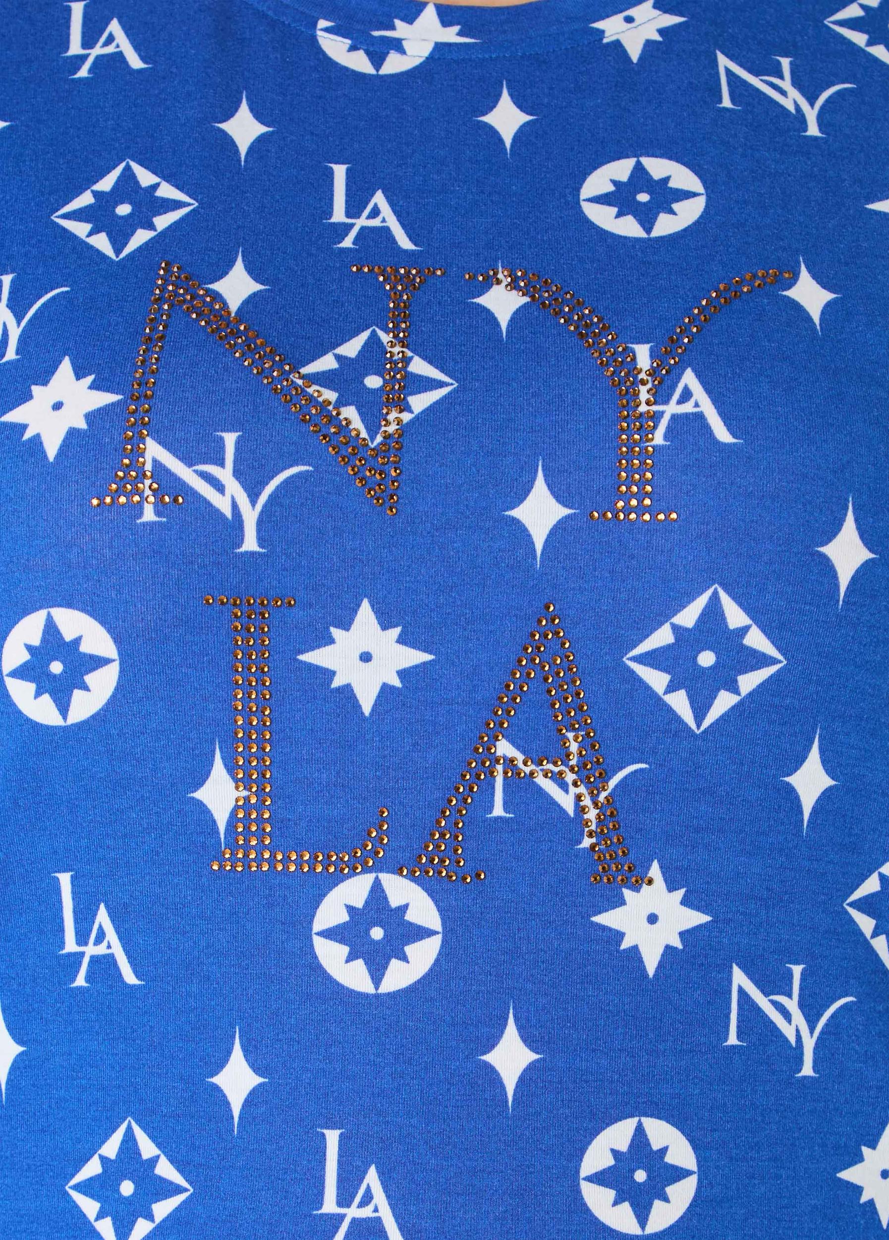 A fashion icon from coast to coast, do the absolute most in our NY to LA tee elevated with Hollywood glam-inspired crystals offset by a trendy luxe print.