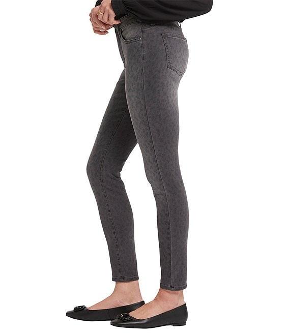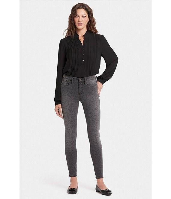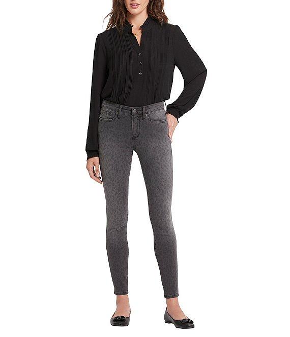 From NYDJ, these jeans feature: Stretch denim fabrication Skinny leg silhouette High-rise waistline Five-pocket styling Minimal animal print detailing Lift Tuck® technology; slimming panel used to flatten and tuck Ankle length Front button/zipper closure Approx. 29" length; 9.75" front rise; 15.25" back rise; 10.5" leg opening Cotton/elastomultiester/lycra elastane Machine wash cold/line dry Imported.