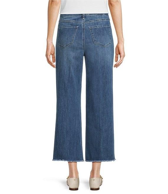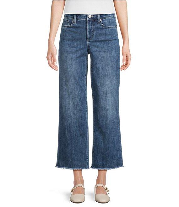 From NYDJ, these jeans feature: Denim stretch fabrication Coolmax breathable technology Wide leg silhouette 5-pocket styling Belt loops Relaxed fit Frayed hemline Zip fly and button closure Approx. 25.5" inseam, 20" leg opening; 10.75" front rise, 16" back rise Cotton/polyester/lycra/elastane Machine wash/line dry Imported.