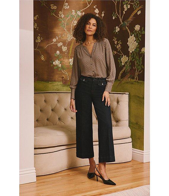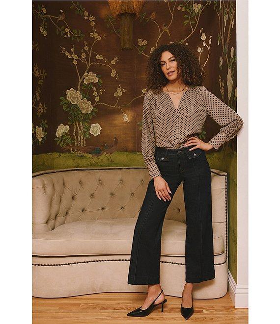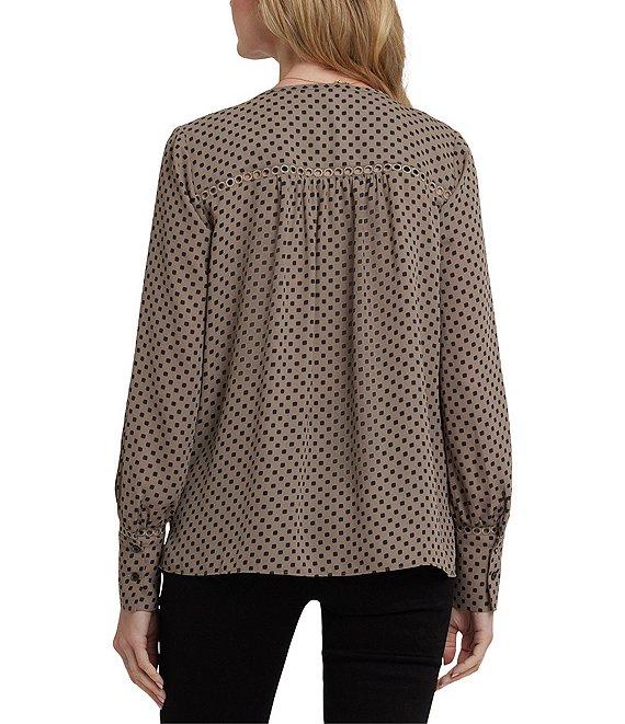 From NYDJ, this blouse features: Flowy silhouette Split v-neckline Long sleeves with button cuffs Dot print Peek-through soutache insets at the shoulders, back and cuffs add a pretty finish Back yoke Button-front closure Approx. 27" length Recycled polyester Machine wash Imported. Liliana Peasant Blouse With its flowy silhouette and a soft, romantic details, NYDJ's Liliana Peasant Blouse is perfect for dressing up your favorite denim. Front and back gathers and voluminous long sleeves with button cuffs give it a polished look, while peek-through soutache insets at the shoulders, back and cuffs add a pretty finish. Features a split neckline and front button closures.