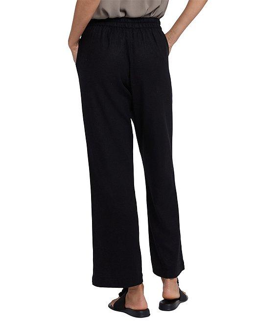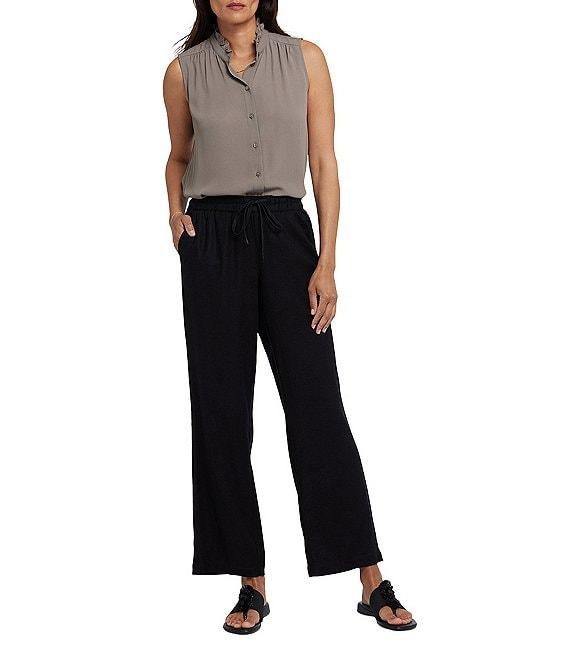 From NYDJ Petite, these pants feature: Stretch fabrication Wide leg silhouette Elastic waist with drawstrings Side front pockets Relaxed fit Pull-on construction Approx. 27.5" inseam, 20" leg opening, 9.5" front rise. 15.5" back rise Linen/viscose/elastane Machine wash Imported.
