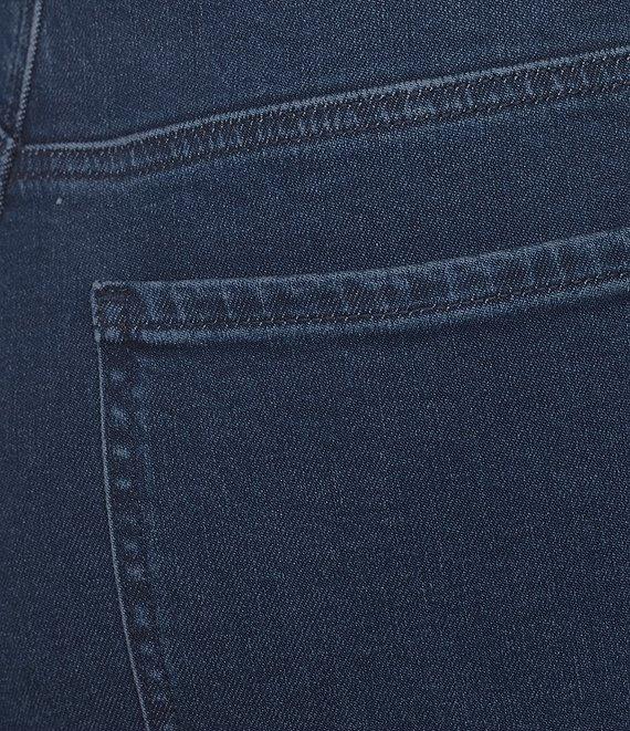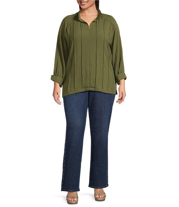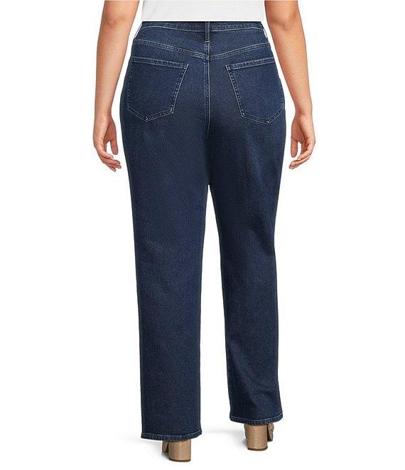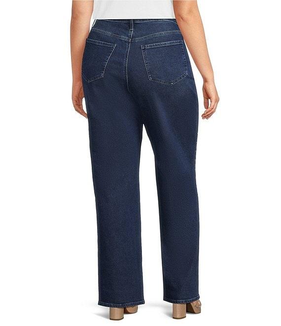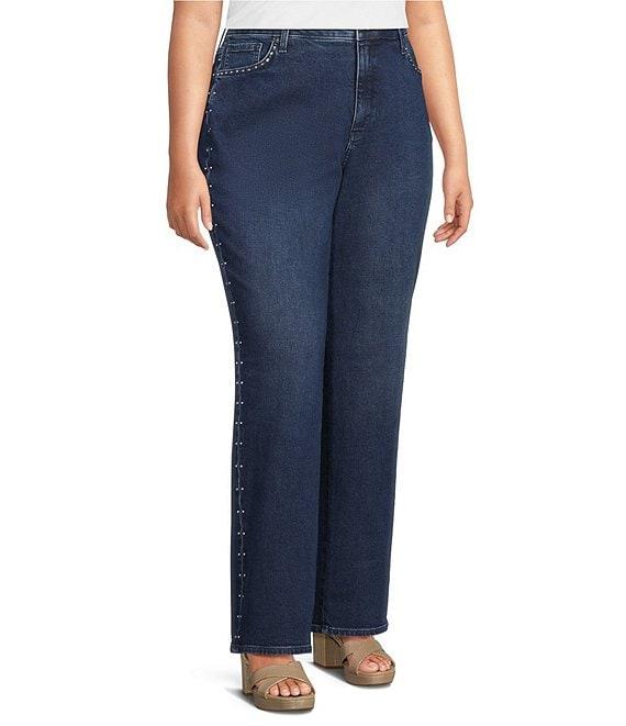 From NYDJ Plus, these jeans feature: Belt loops 5-pocket styling Loose straight leg Dropped waist It can also be worn as a high-rise style Sparkling rhinestone detail along the side seam Straight hem Button and zip fly Approx. 32" inseam, 20" leg opening, front rise: 14, back rise: 19" Cotton/elastane, exclusive of decoration Machine wash/line dry Imported.