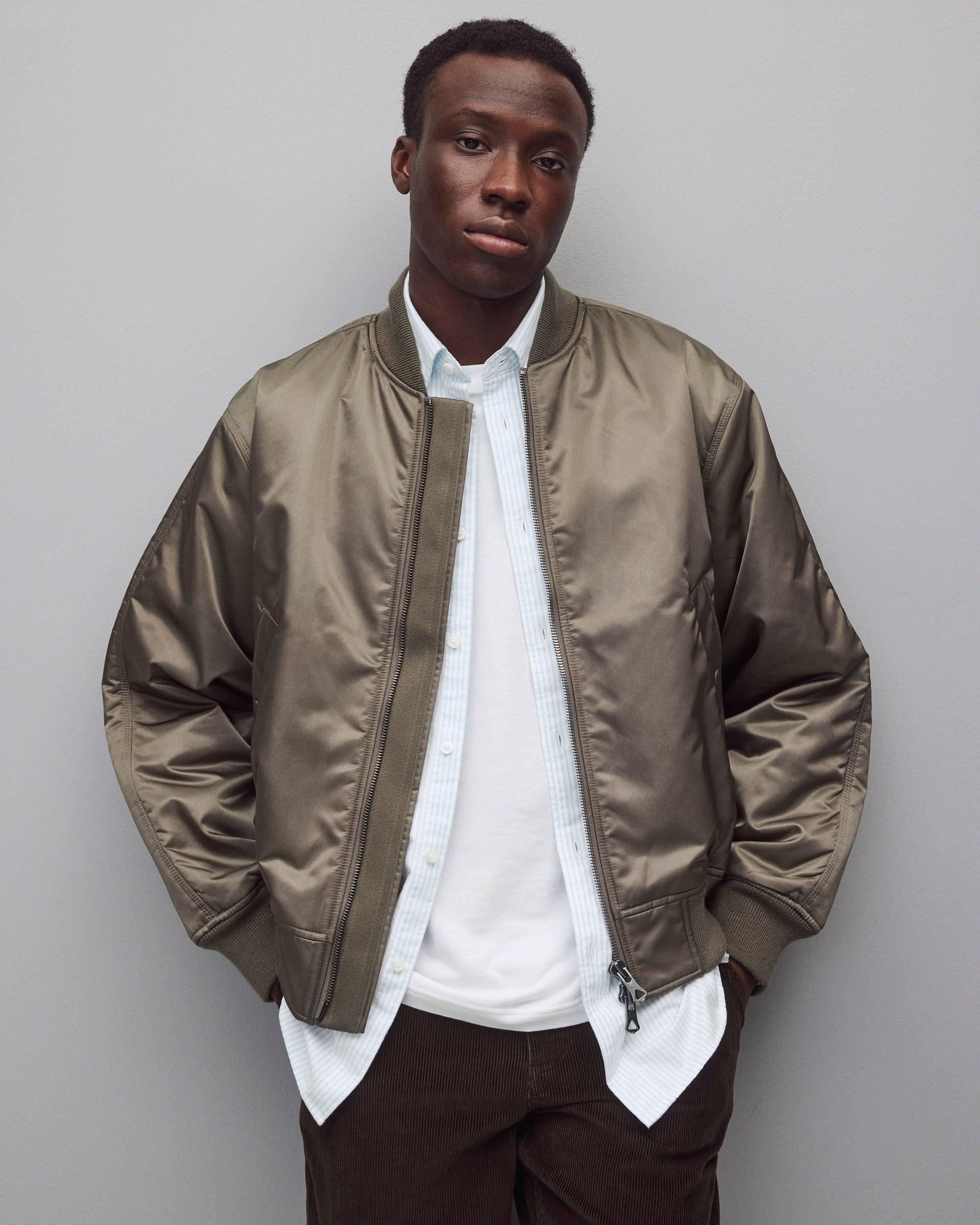 This military-inspired flight jacket is crafted from premium satin twill with a durable water-repellent finish. Featuring a standard fit with slightly cropped hem, and PrimaLoft® insulation for efficient warmth. Designed with robust triple needle stitching, heavy-gauge YKK two-way zip closure, corded welt pockets, an interior chest pocket, and durable rib collar, cuffs and hem.