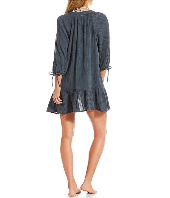 From O'Neill, this swim cover-up features: Gauze fabrication Dress silhouette Split v-neckline Long sleeves with adjustable ties Ladder trim detail Flowy relaxed fit Unlined Tiered hemline Pullover construction Cotton gauze Hand wash Imported. Lou Mini Coverup Dress A flowy and relaxed fit coverup to elevate your beach look. The O'Neill's Lou Mini Coverup Dress has long sleeves, 28 1/2 center front length, ladder trim throughout and functional ties at sleeve hems.