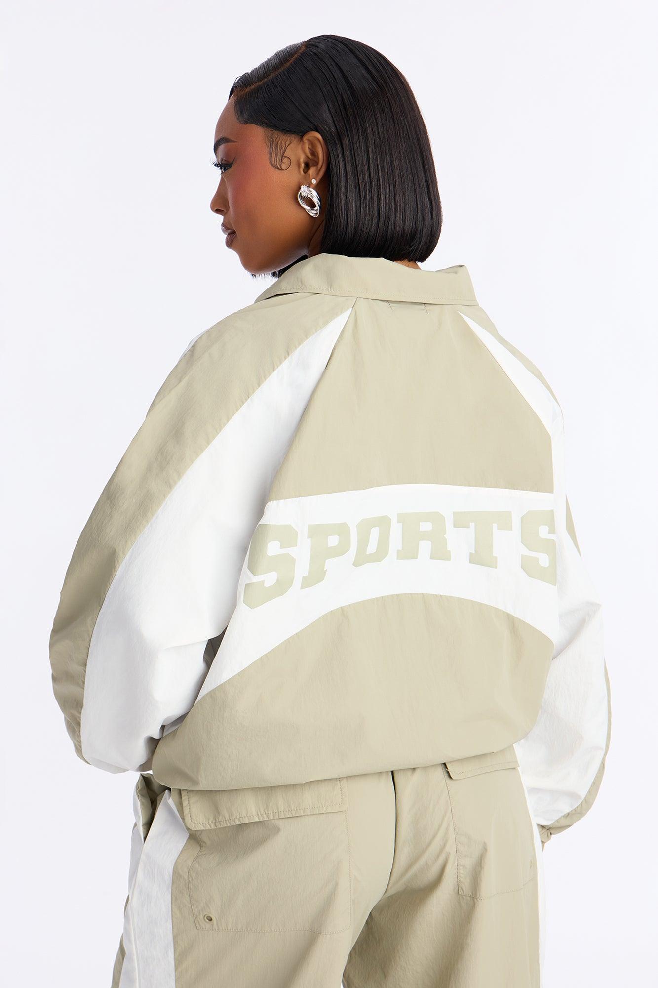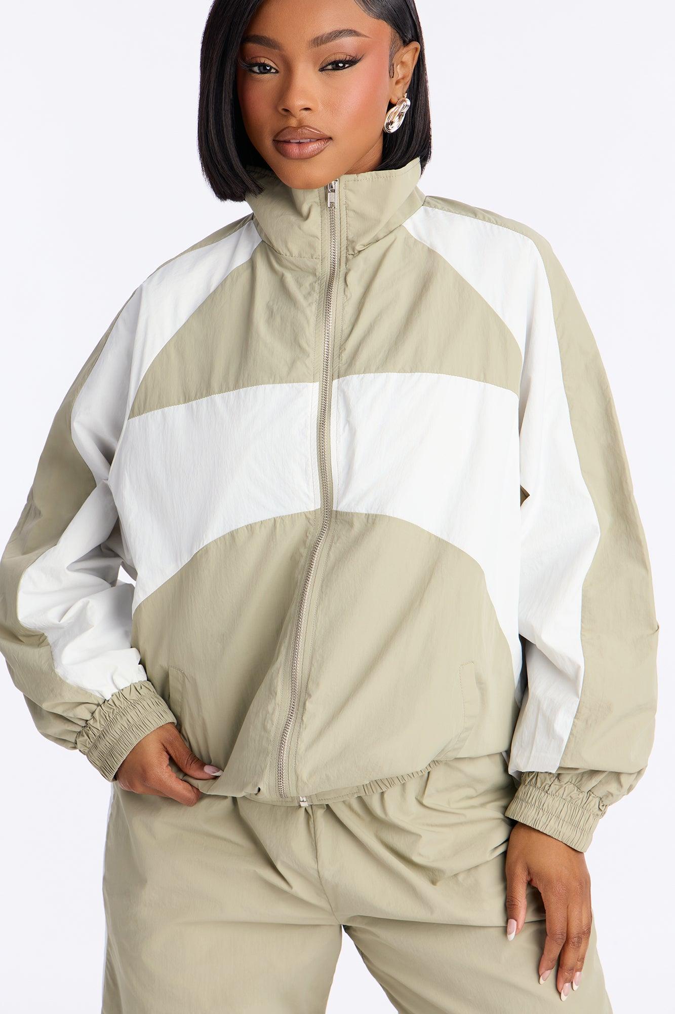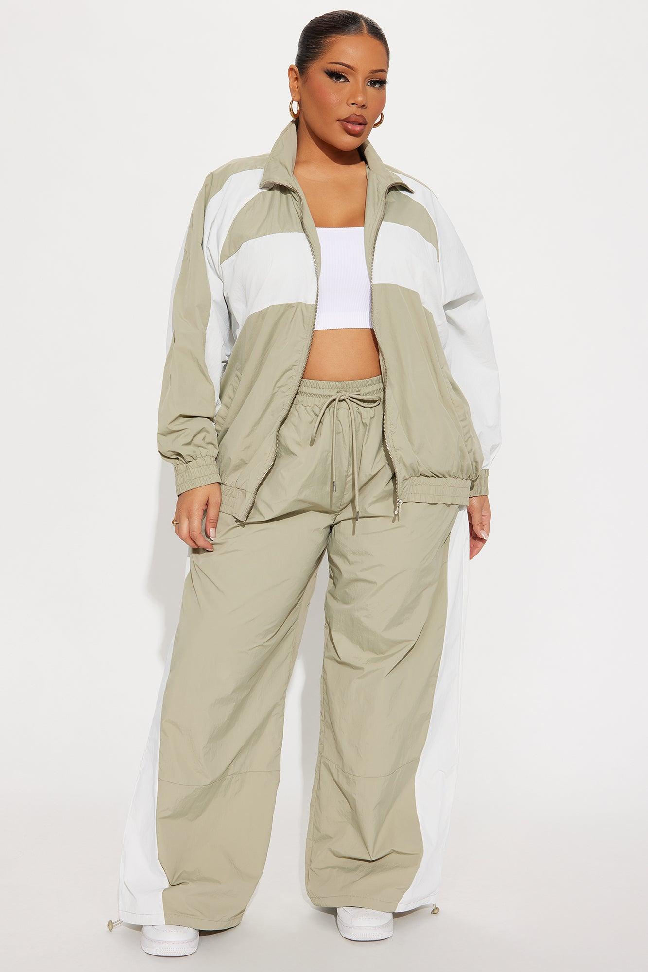 Available In Sage. 2 Piece Ensemble Zip Up Jacket And Jogger Pant Set Non Stretch Inseam 31" Fully Lined Back Graphic Pockets Drawstring Elastic Waistband Bungee Strap Detail On Pant Hem Self: 100% Nylon Lining: 100% Polyester Imported California Proposition 65WARNING: Cancer and Reproductive Harm - www.P65Warnings.ca.gov.