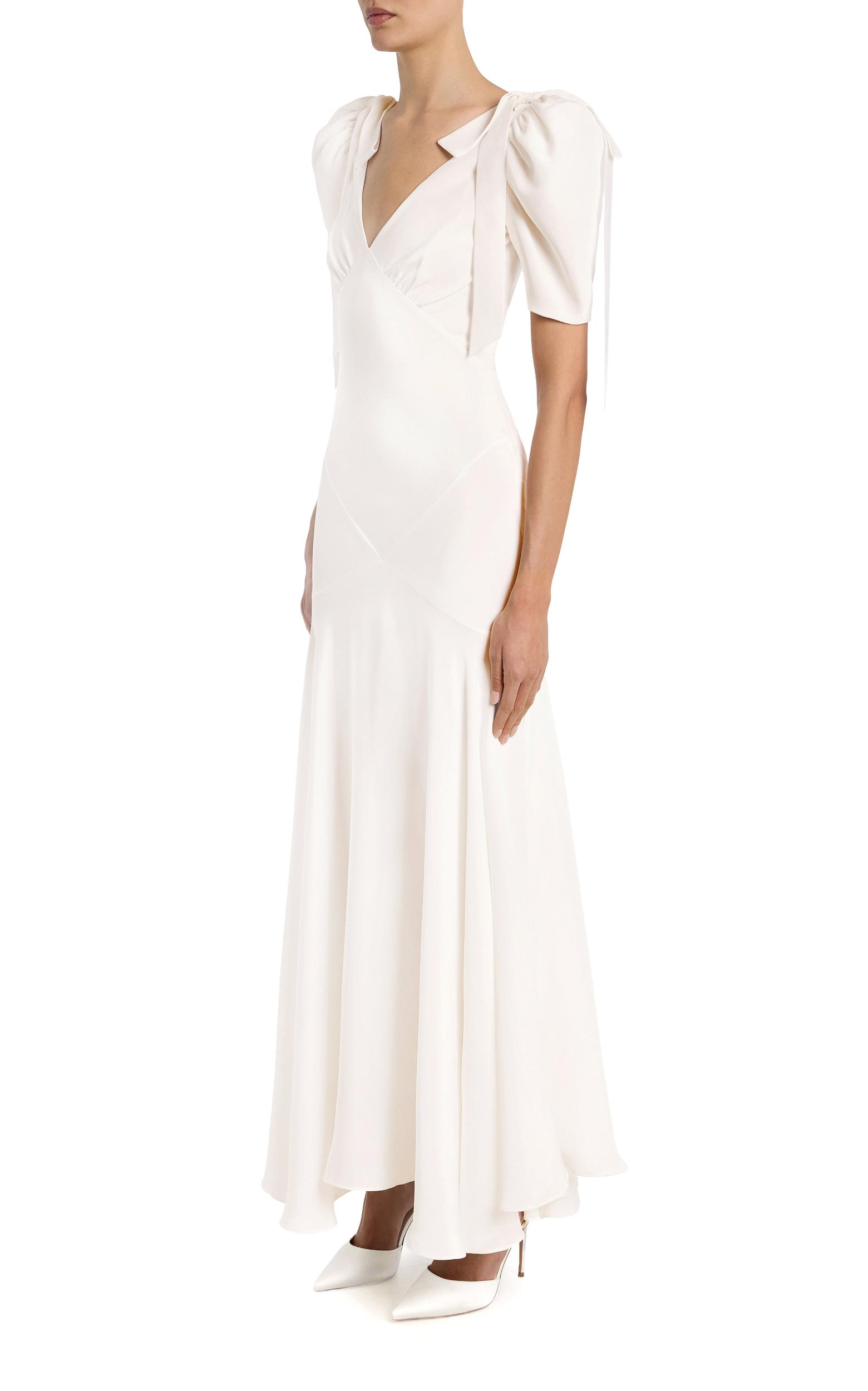 Cut on the bias in lustrous off-white silk two ply crepe, this bias cut gown features an inlay of cross body panels, echoed by white velvet bows that tie over the puff shoulders. The empire waistline gently flares to a maxi length, and is fit to perfection. This dress is lined with a complimentary off- white silk crepe.