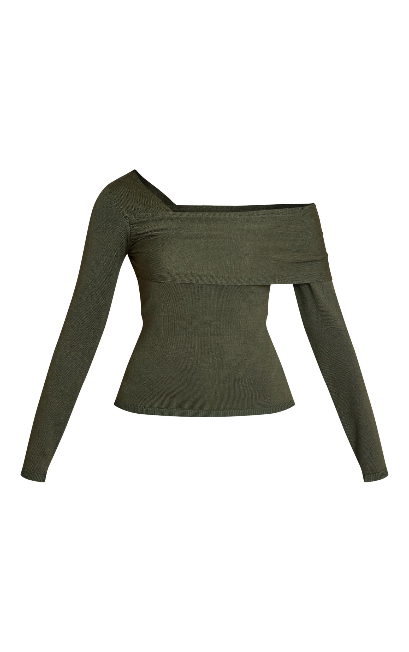 Make a definitive style statement this season; the olive long sleeve asymmetric shoulder knitted top is the modern answer to sophisticated evening dressing. This distinctive olive piece features a bold asymmetric neckline that artfully drapes across one shoulder, creating an intriguing silhouette, perfectly balanced by its full-length sleeves. For a look that commands attention, style this knitted top with high-waisted tailored pants and a pair of contemporary ankle boots, completing the ensemble with a chic black bag for an effortlessly refined aesthetic.Length approx 48.5cm/19inch (Based on sample size S)Model wears size SModel Height - 5ft 7inchp]:!mb-4inch>Category: KnitwearProduct type: Bardot TopColor: OliveMaterial: KnitOccasion: Evening