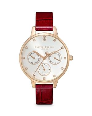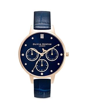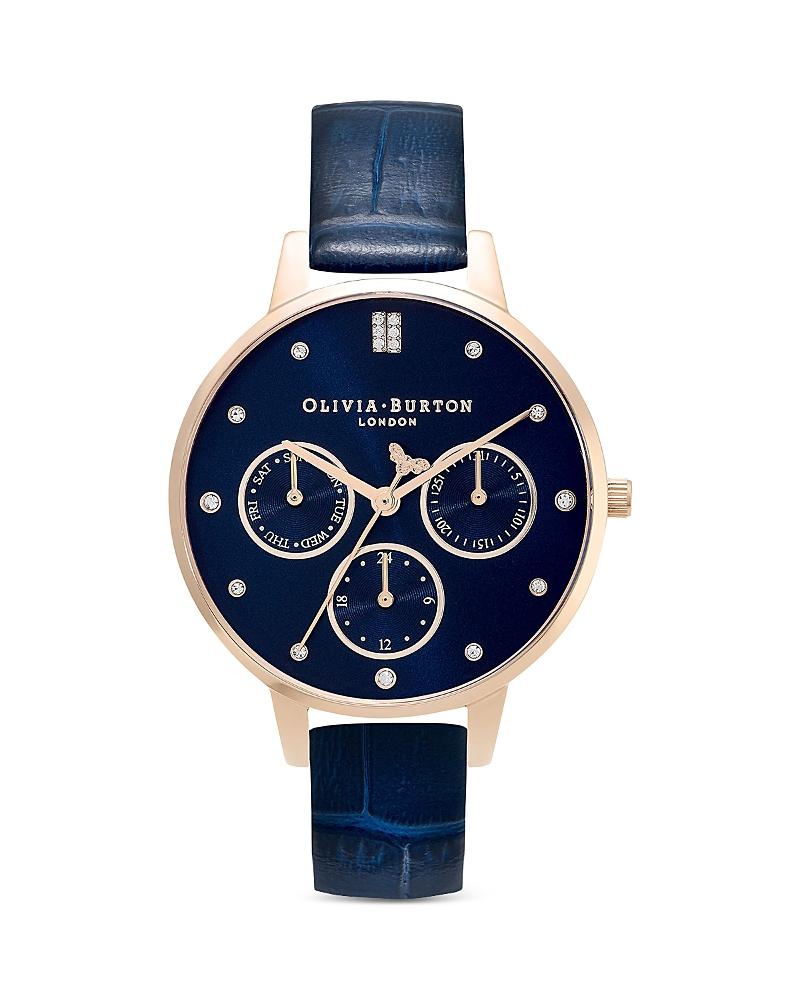 From Olivia Burton, the Chronograph Stainless Steel Case Forest Green Leather Strap Watch features: Ionic gold-plated stainless steel caseGreen sunray, stone dialForest green faux-croc leather strapGold accents and signature bee on second handHinge closureChronograph movementCase diameter approx. 34mm Water Resistance: 3BImported.