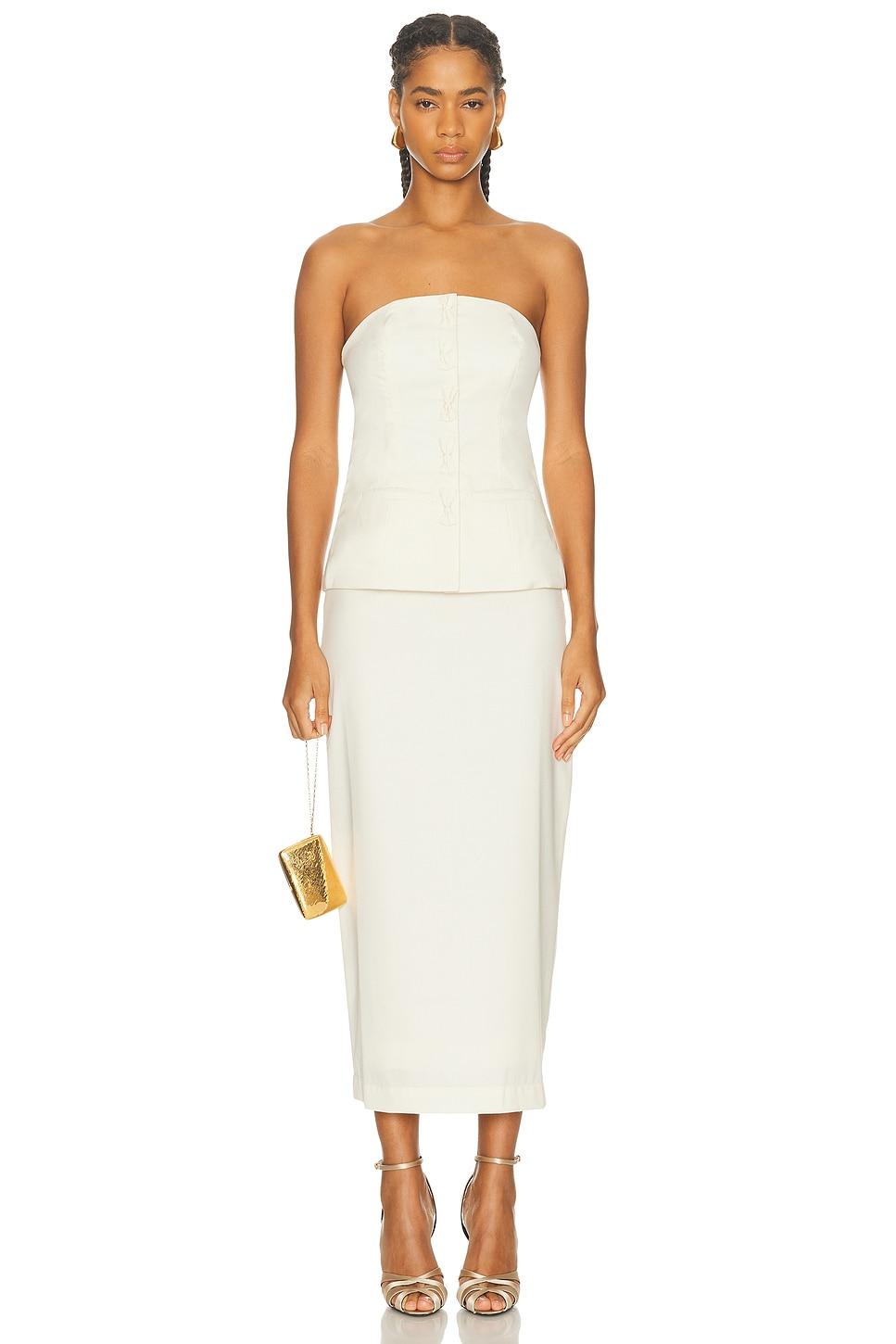 topSelf: 55% polyester, 45% woolLining: 100% viscose / Dry clean only / Front snap button closure / Front faux welt pockets / Front bow detailing / Midweight crepe fabric / Item not sold as a set / Made in India / Our Style No. MSGF-WS6 / Manufacturer Style No. MG-FW25-105 / Model is wearing size S.