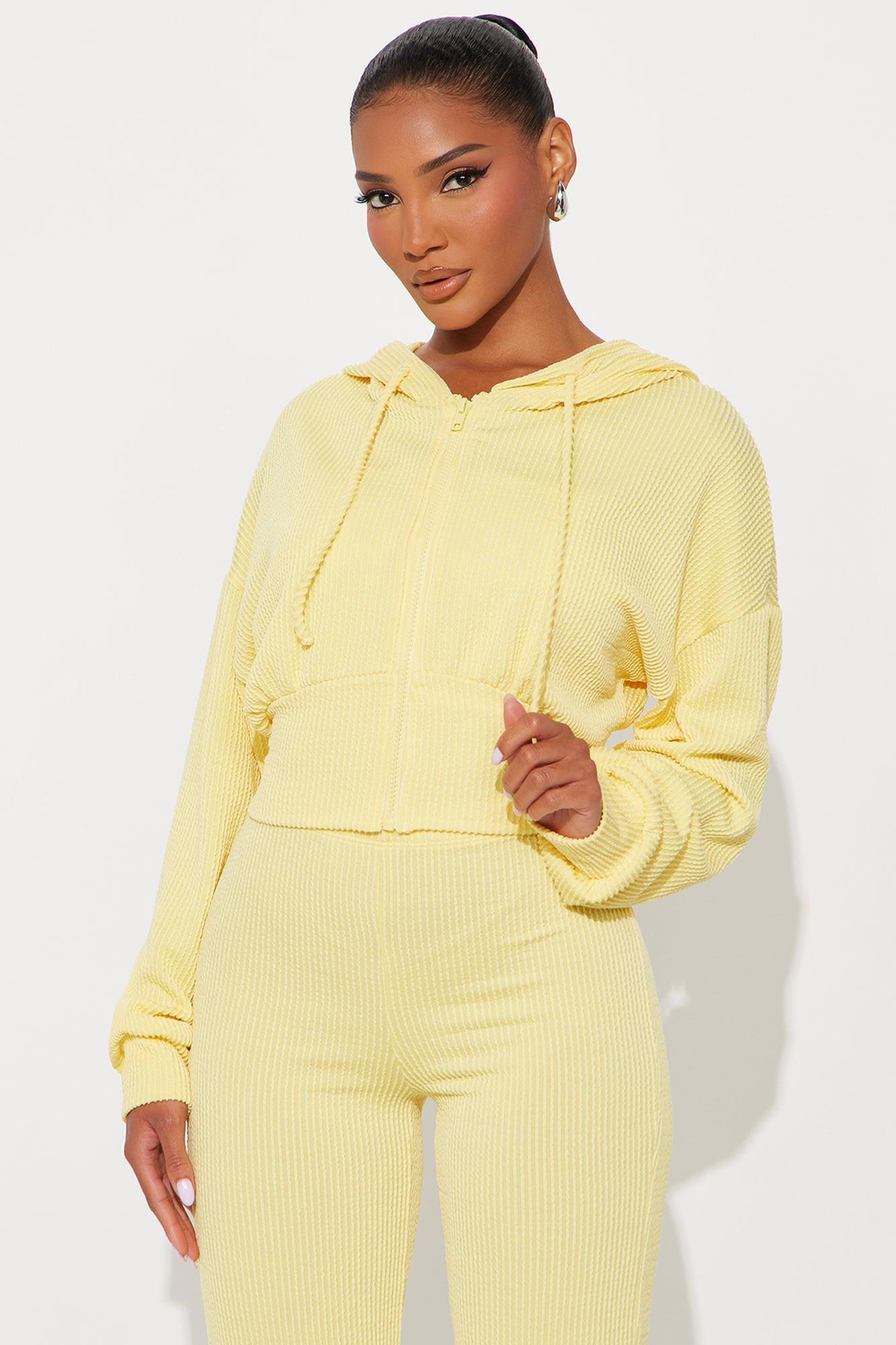 Available In Teal And Yellow. 2 Piece Ensemble Zip Up Hoodie And Flare Pant Set Stretch Inseam 33" Elastic Waistband Self: 78% Polyester 19% Rayon 3% Spandex Imported California Proposition 65WARNING: Cancer and Reproductive Harm - www.P65Warnings.ca.gov.