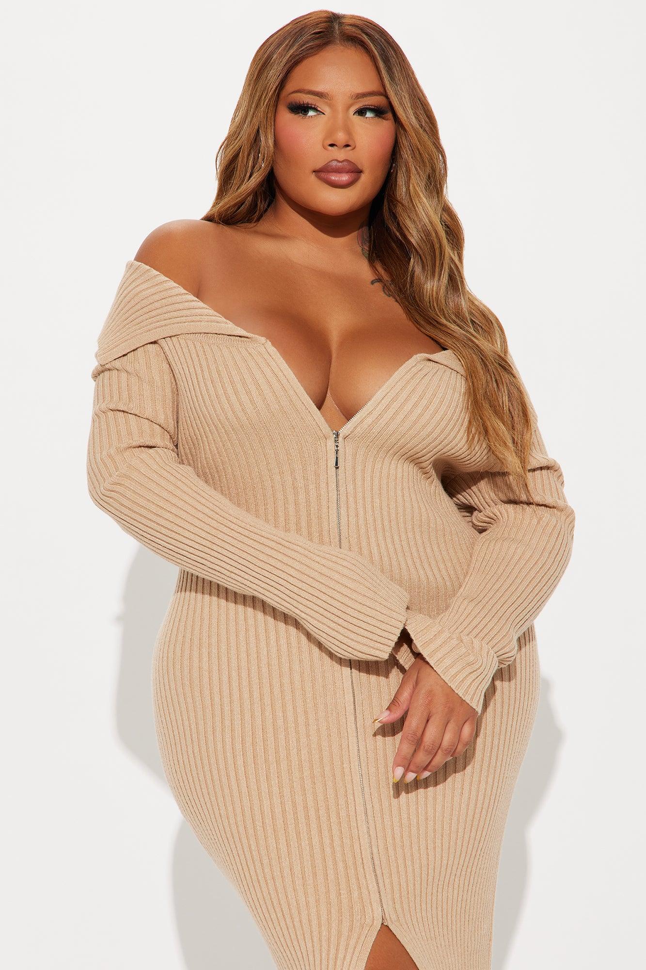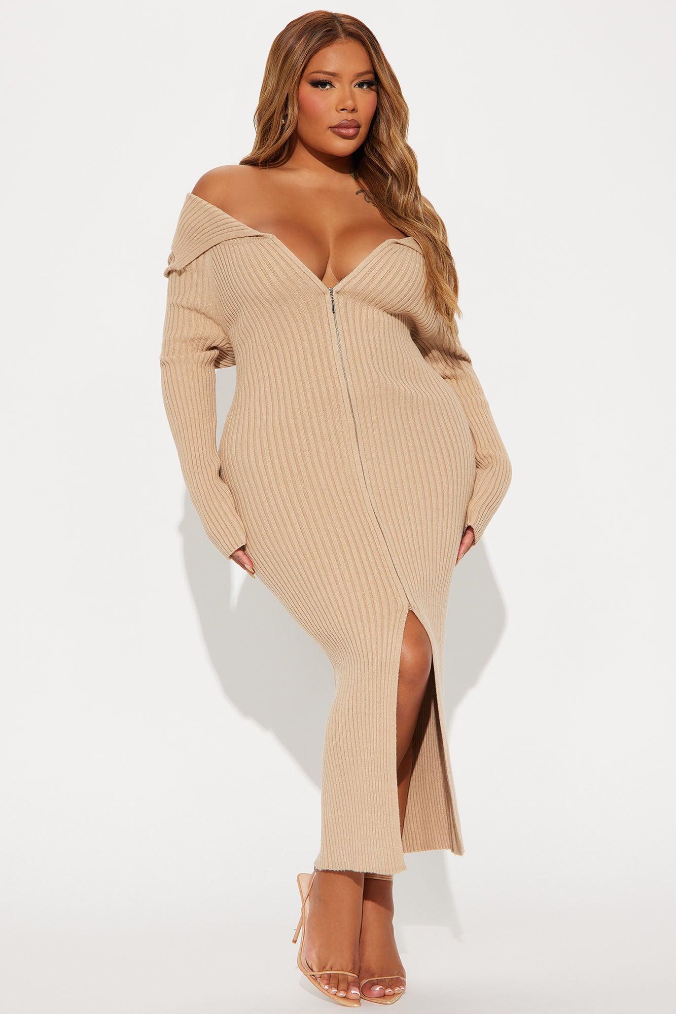 Available In Tan. Sweater Midi Dress Off the shoulder Foldover neckline Long sleeves Zip front Front slit Stretch Length = 49" 51% Rayon 30% Polyester 19% Nylon Imported California Proposition 65WARNING: Cancer and Reproductive Harm - www.P65Warnings.ca.gov.