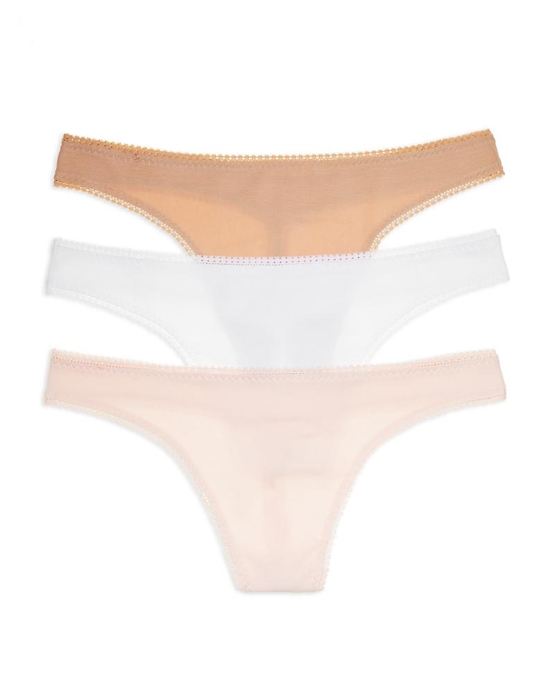 Supersoft and stretchy pima cotton lends a comfortable, barely there fit to everyday thongs traced with gently scalloped trim. Pack of three assorted thongs Lined gusset 90% pima cotton, 10% spandex Machine wash, tumble dry Made in Peru Womens Clothing